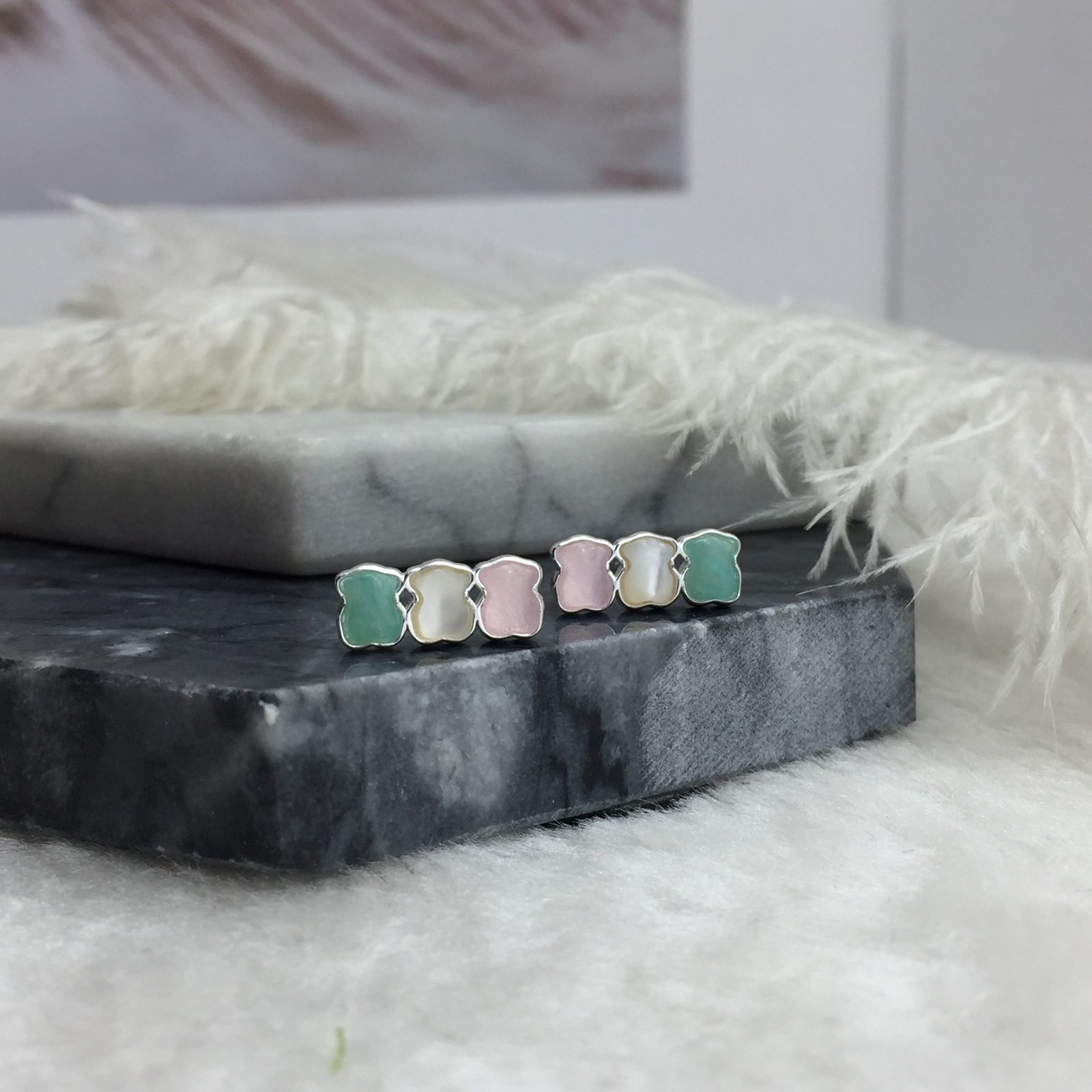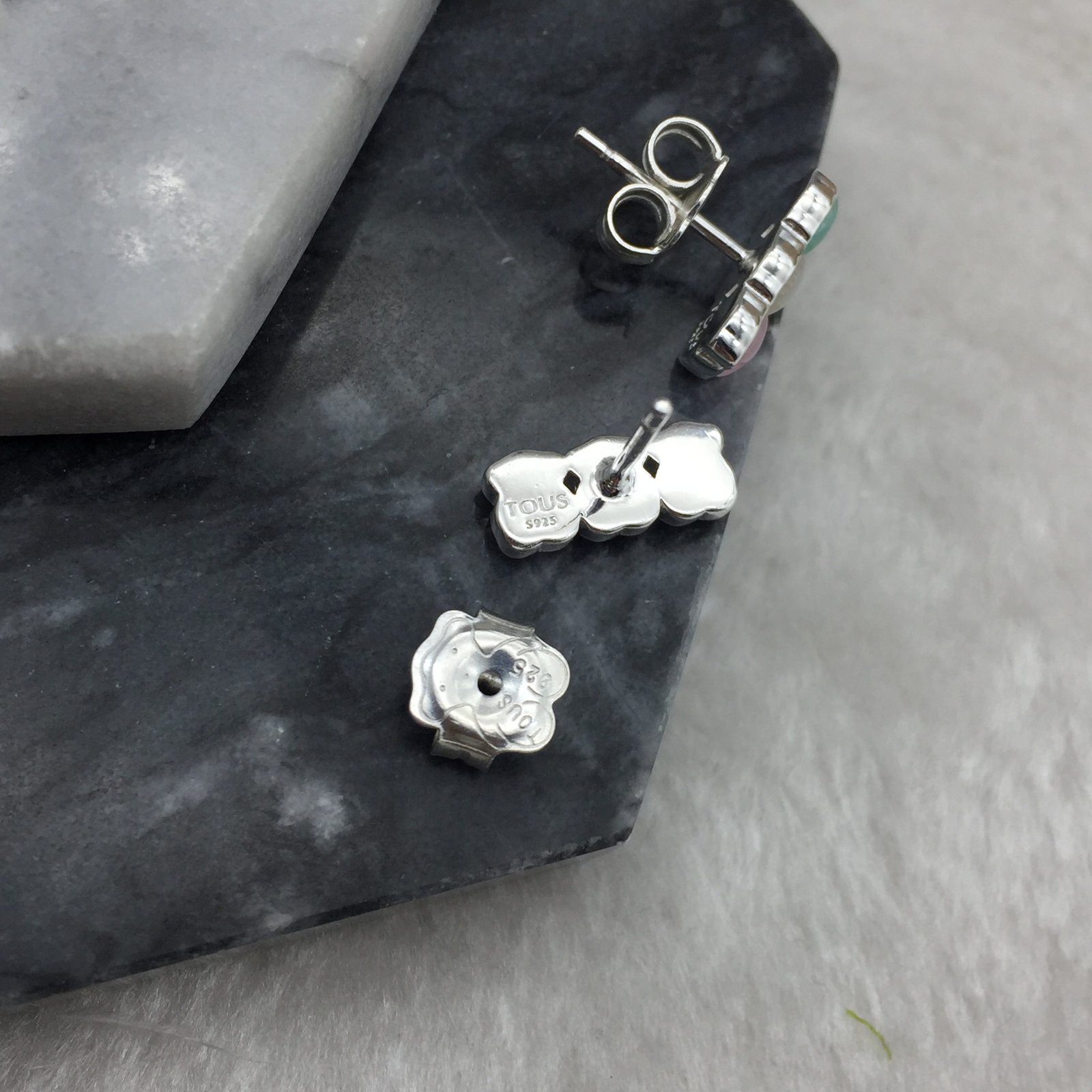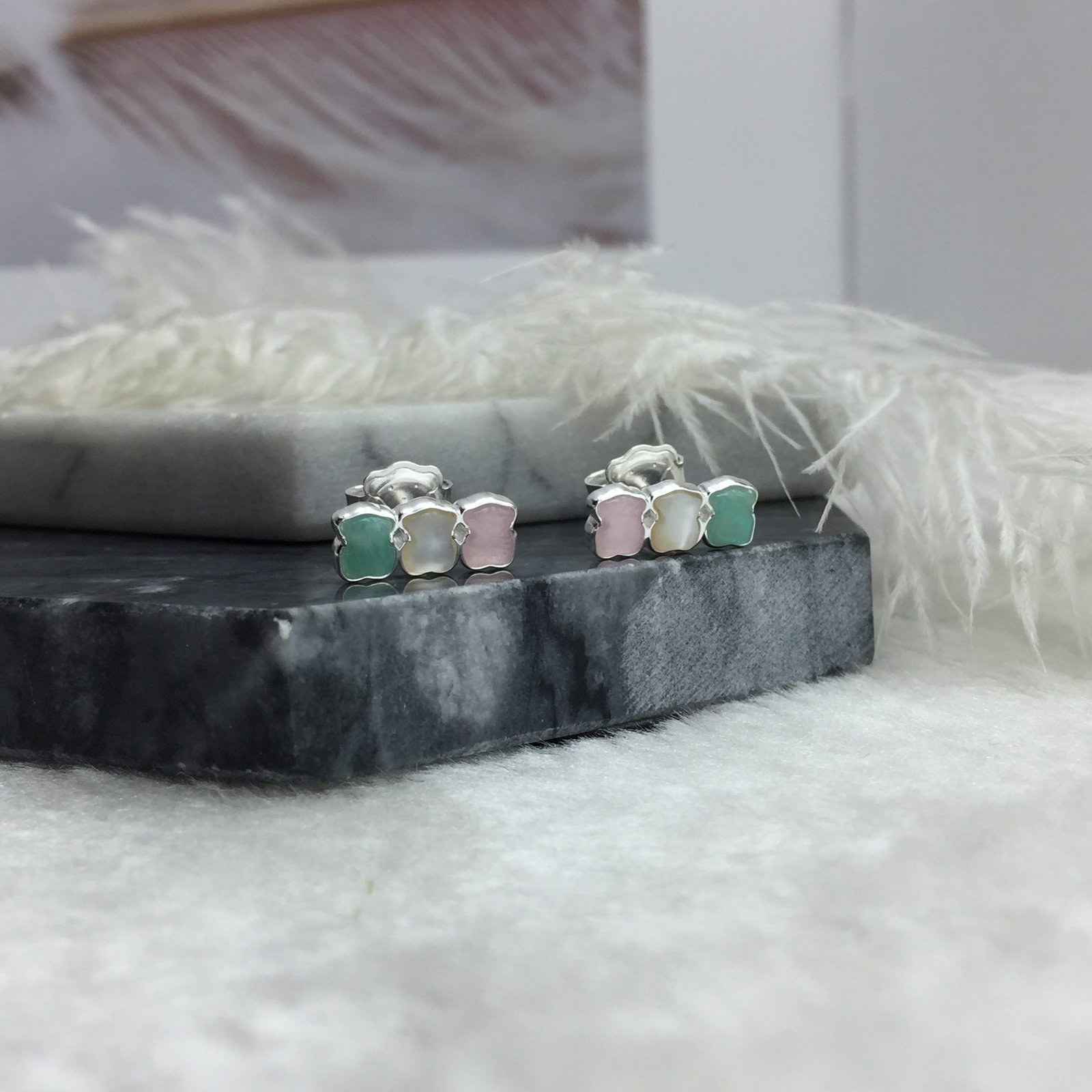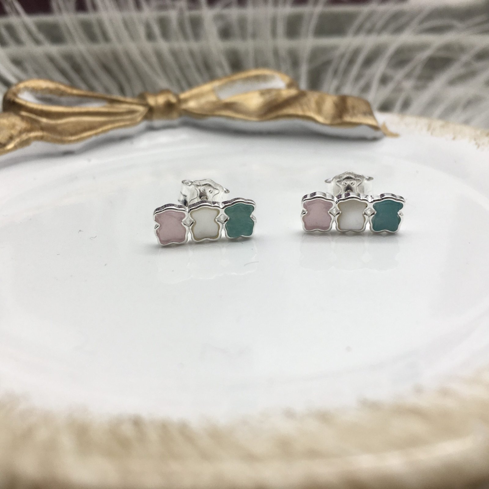 TOUS Mini Color earrings made of sterling silver with 3 bears made of pink quartzite, mother of pearl and amazonite. With a fixing pin. Size: 1.2 cm.