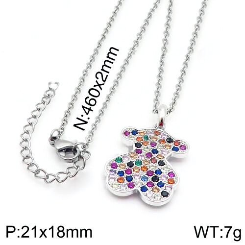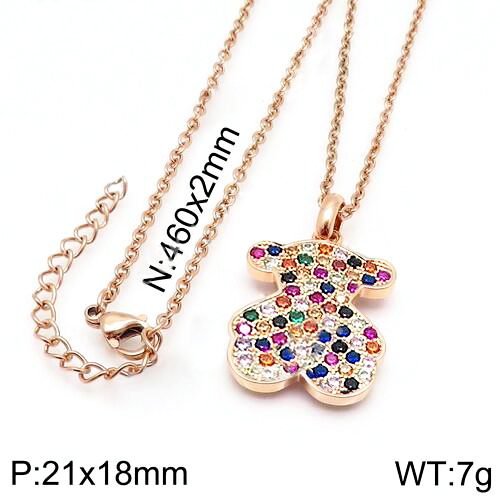 This necklace pendant is a masterpiece that combines modern design with traditional craftsmanship. Using high-quality stainless steel as the main material ensures the durability and corrosion resistance of the product. The image of the little bear on the pendant is lifelike, full of childlike fun and vitality. What’s even more attractive is that the little bear is adorned with multiple colorful gemstones, each shining brightly like the brightest star in the night sky. The image of the little bear on the pendant is designed very cute, with rounded lines and exquisite details that make the little bear look lifelike. This pendant is not only suitable for women to wear, but also loved by male consumers. The inlay of colored gemstones is a major highlight of the teddy bear necklace pendant. These gemstones not only add color to the pendant, but also make the entire pendant look more exquisite and luxurious. The length of this necklace is 46cm, and the pendant is 21x18mm.