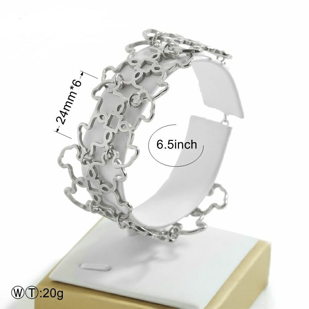 This bracelet cleverly blends geometric aesthetics with cute bear elements, bringing a visual feast to your wrist through versatile color combinations. Selected stainless steel: The bracelet is carefully crafted from high-quality stainless steel material, ensuring its durability and corrosion resistance. The unique silver gray color of stainless steel, simple yet sophisticated, can perfectly blend with various skin tones, showcasing the wearer’s unique temperament.