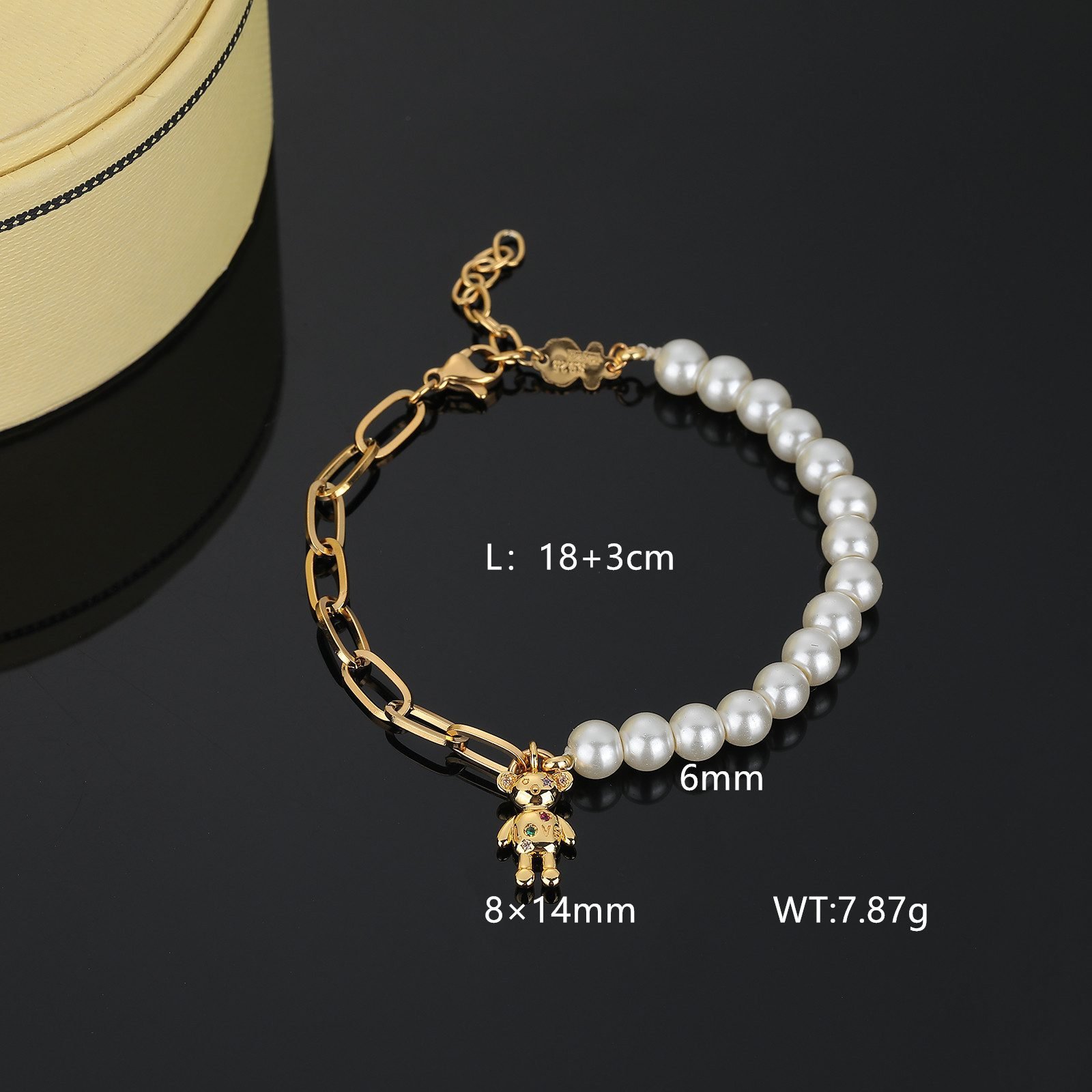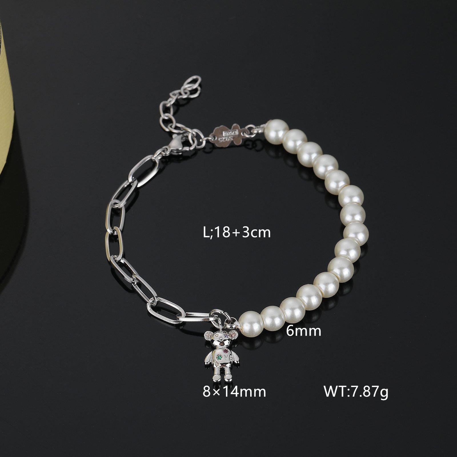 Exquisite pearl inlay: Half of the bracelet is made up of carefully selected pearls strung together, each pearl carefully selected, round and full, with a warm luster, showcasing the beauty of nature and elegant temperament. The softness of pearls contrasts sharply with the toughness of stainless steel, yet they coexist harmoniously, showcasing a unique beauty. 3D teddy bear design: On the other end of the bracelet, a cute 3D teddy bear stands out. The little bear is finely carved from stainless steel material, with smooth lines and strong three-dimensional sense, as if a real little bear is playing between its wrists, adding infinite vitality and fun to the bracelet.