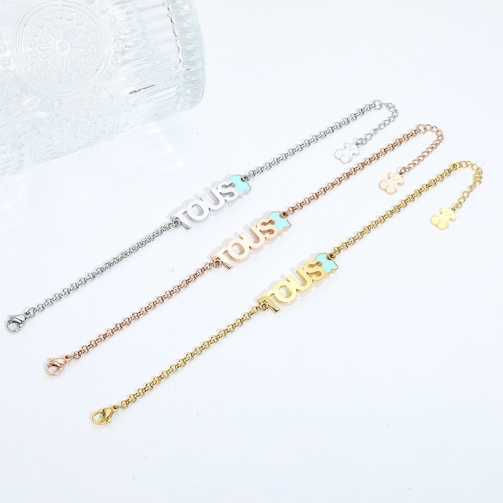 Love “plaque design: The center of the pendant is embedded with a delicate” Love “plaque, with elegant and smooth font, symbolizing deep and sincere emotions. Whether worn by oneself or given as a gift, it can perfectly express the love in one’s heart. The chain body design is simple yet exquisite, with smooth lines that intimately touch the skin, showcasing the wearer’s elegant temperament. Blue Pink Bear: The focus of the bracelet is the Spanish bear presented in both blue and pink colors. The image of Little Bear is charmingly simple, with a fresh and elegant blue and pink color scheme that retains the classic elements of TOUS brand while incorporating modern fashion sense. Like the necklace, the bracelet is also made of stainless steel material to ensure comfort and durability when worn. Every element on the bracelet has been carefully polished, and the bear shape is lifelike, showcasing the unique craftsmanship of the TOUS brand in every detail. This TOUS stainless steel “Love” necklace and blue pink teddy bear bracelet set perfectly blend romantic, warm, and fashionable elements. Whether as a token of love between couples or as an emotional bond between mother daughter and best friend, it can convey deep emotions and beautiful wishes. Wearing it, it feels like being surrounded by love at all times, making every day full of happiness and sweetness. Choosing the TOUS set means choosing a perfect interpretation of love, beauty, and fashion. Let this unique gift become a beautiful scenery in your or your loved one’s life, witnessing every precious moment.