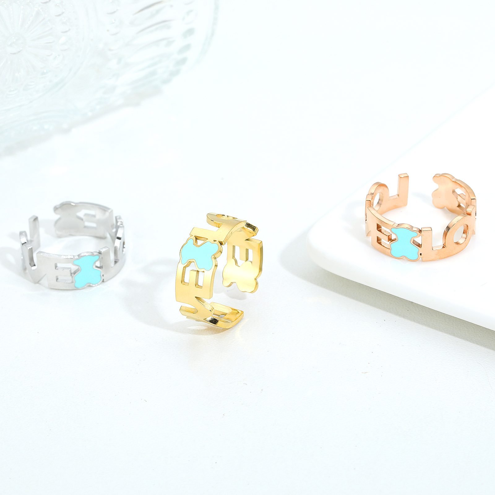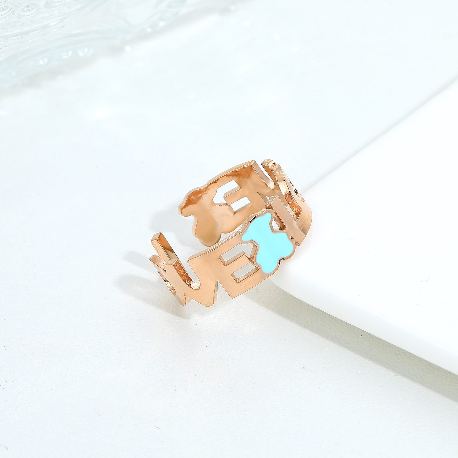 The highlight of the design lies in its unique “love” letter frame. This framework is presented in elegant font form, simple yet powerful, representing not only the promise and eternity of love, but also the visual center of the ring. Inside the framework, a blue little bear leapt onto it, as if conveying signals of love and happiness. The blue coating of the bear contrasts sharply with the silver white of the stainless steel, adding a touch of freshness and vitality to the ring.