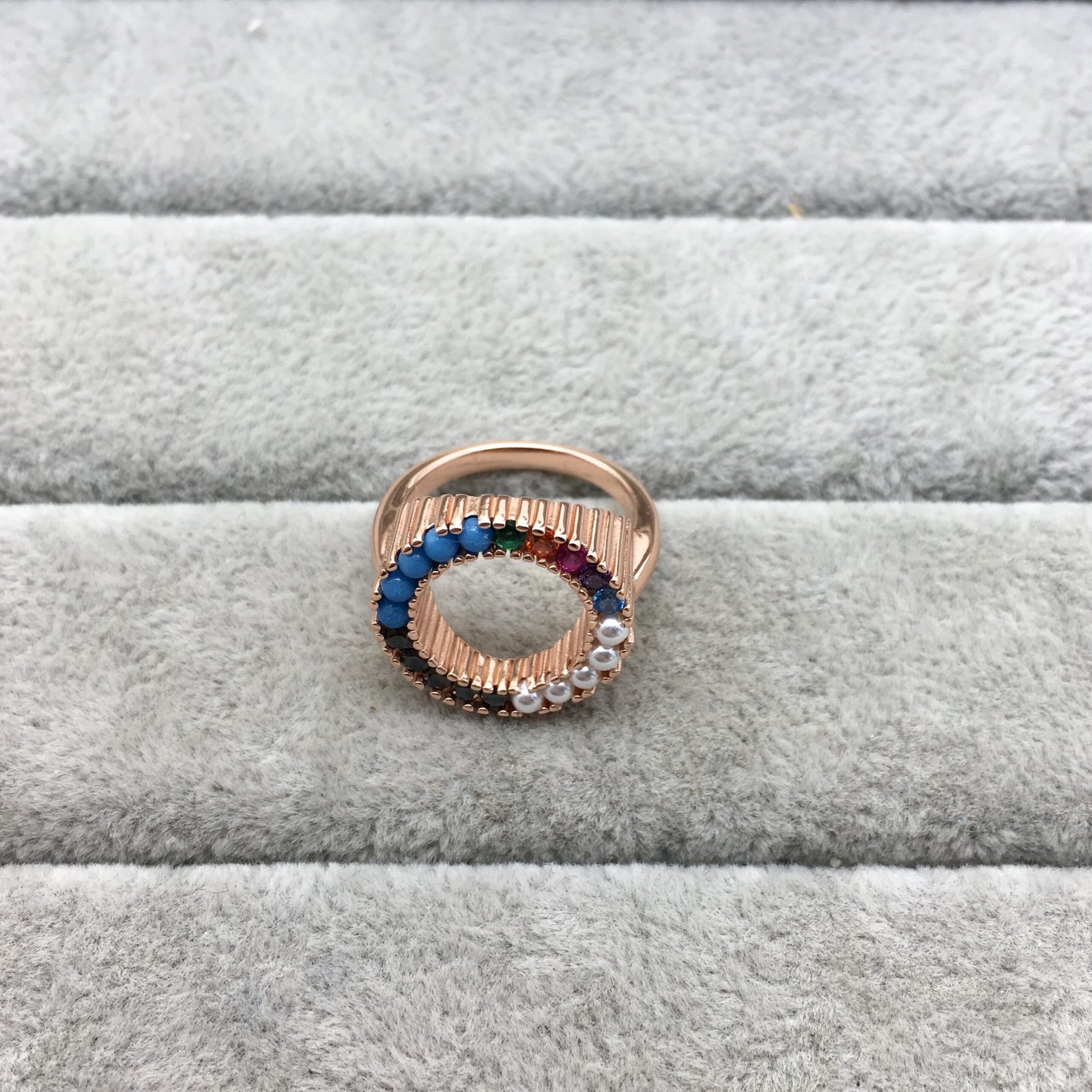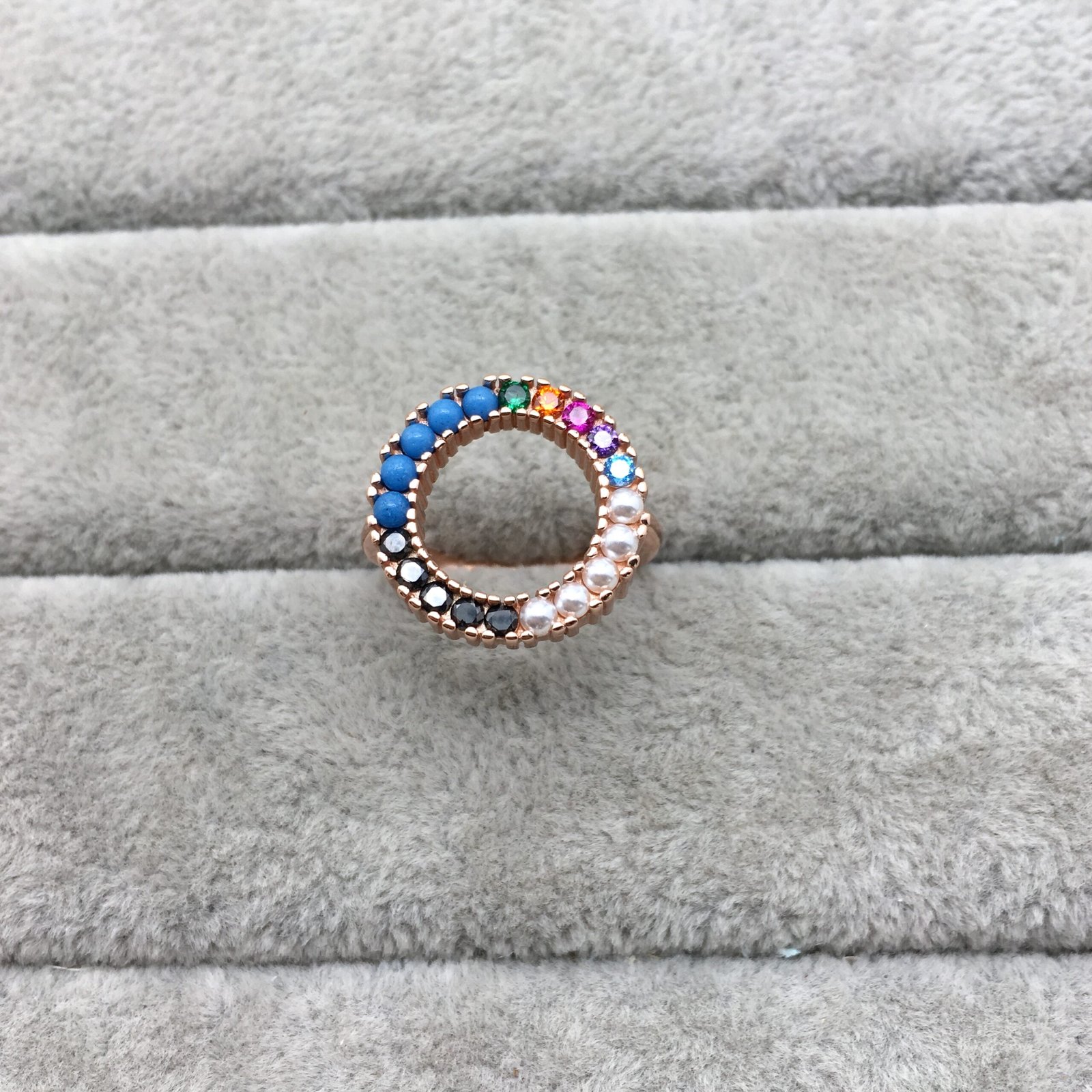 TOUS Straight disc Ring in rose silver vermeil with turquoise, tsavorite, orange sapphire, ruby, amethyst, blue topaz, pearls and spinels. Disc size: 1.6 cm. Vermeil is a layer of 18kt gold on sterling silver with a minimum thickness of 2.5 microns, with no other material between them.