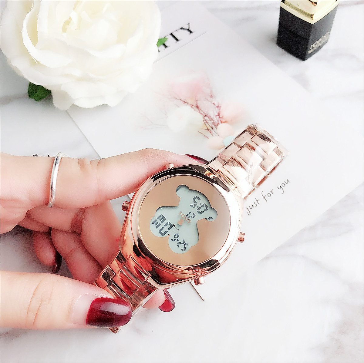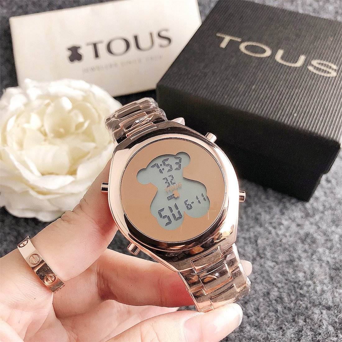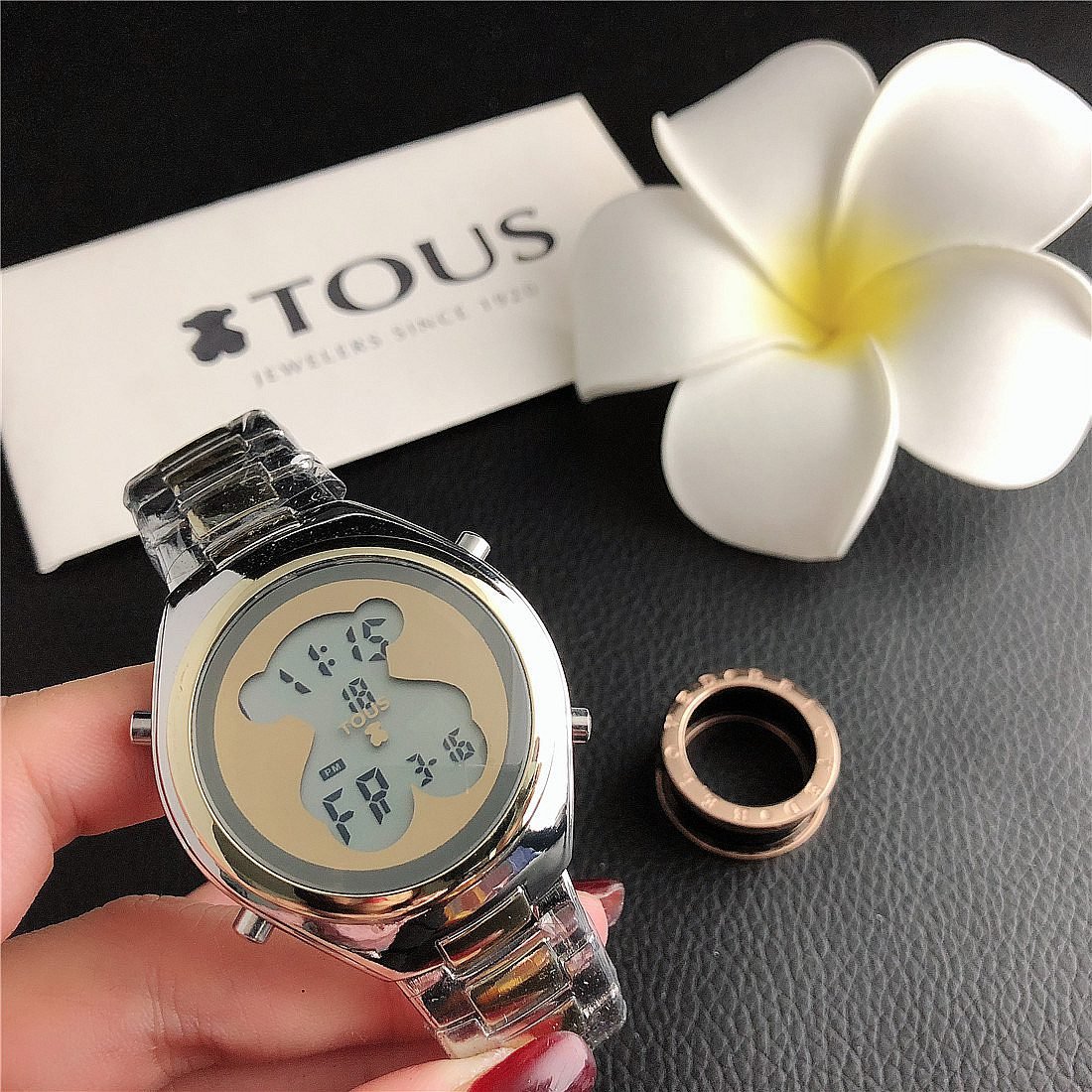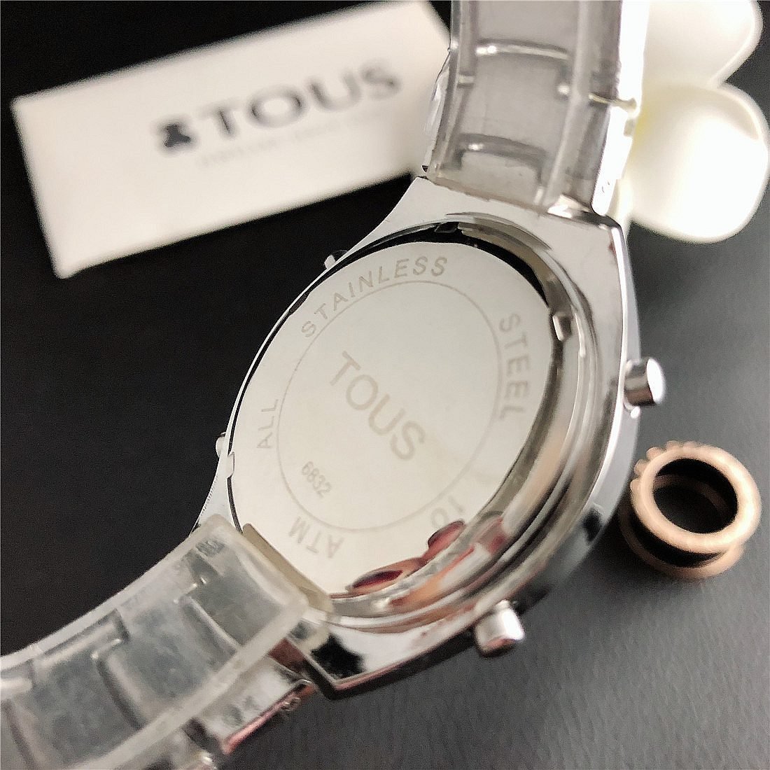 The central position is printed with a peach bear pattern, which is the logo of the TOUS brand, adding unique personality and recognition to the watch.