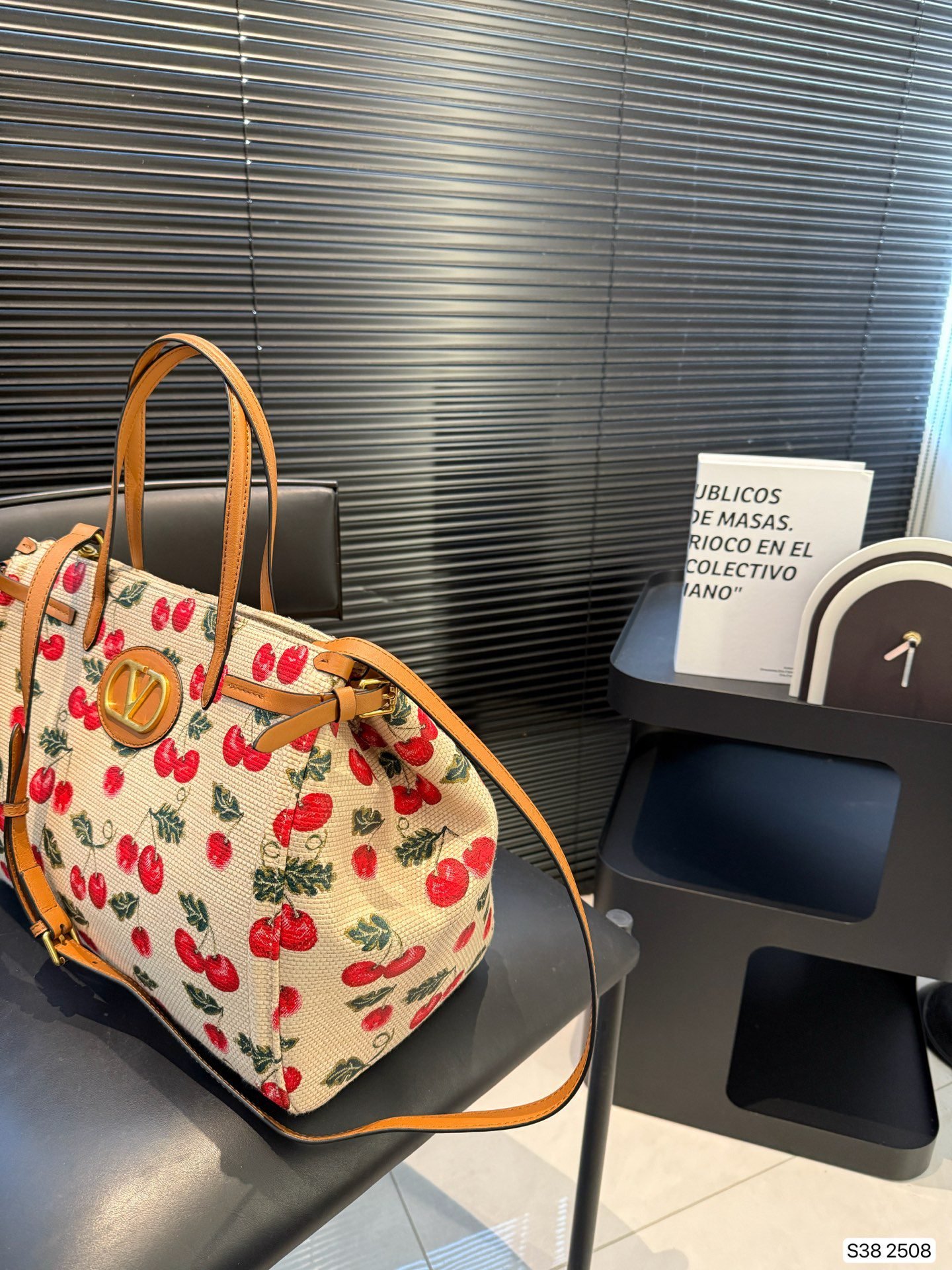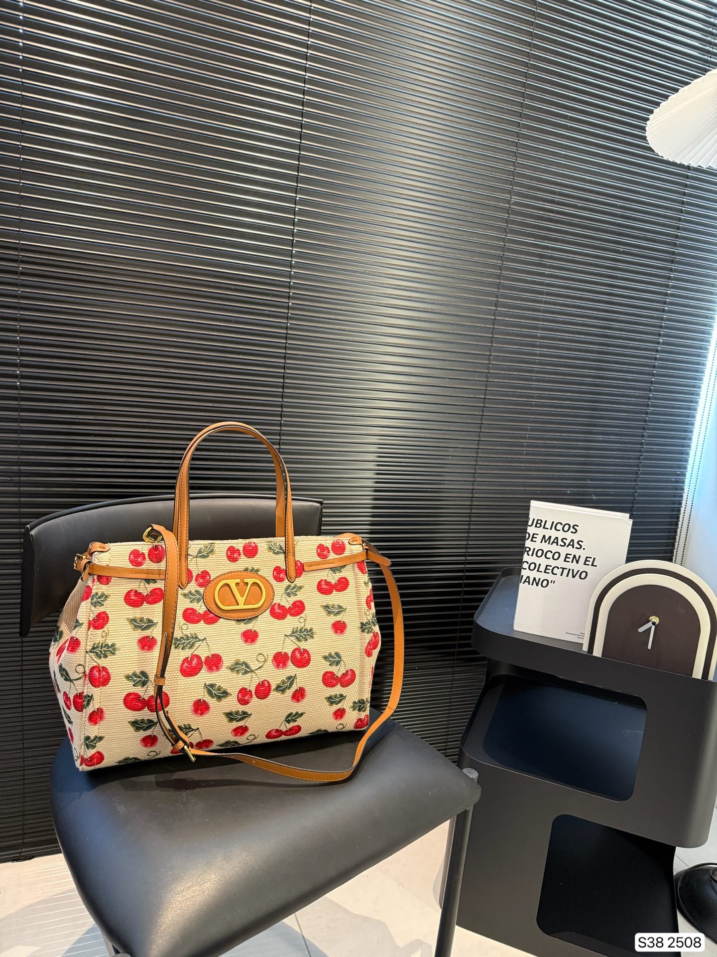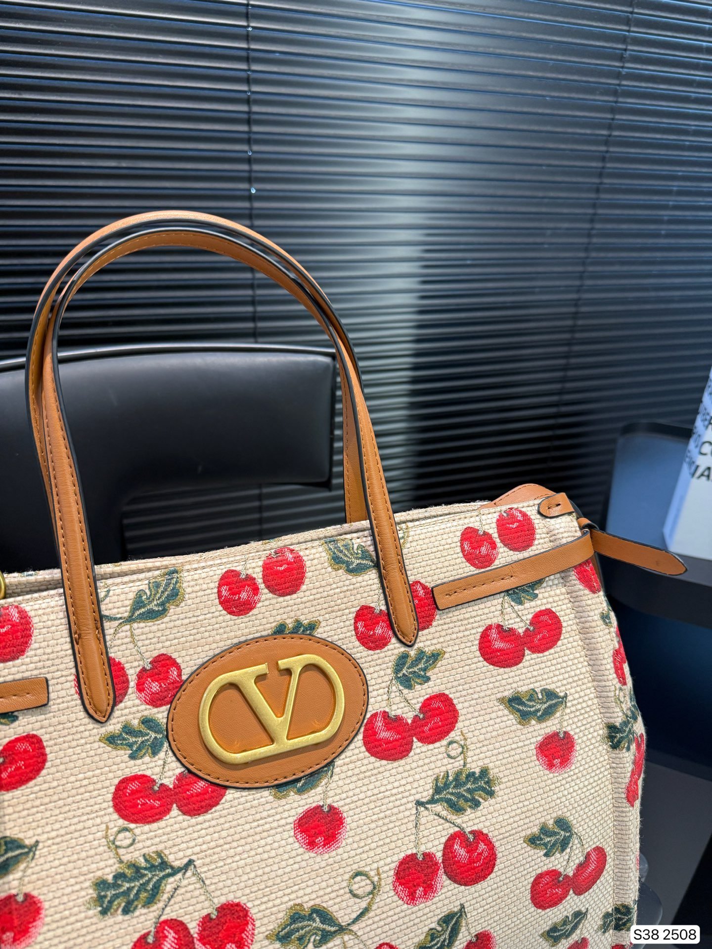 This Valentino cherry-print tote bag features a charming cherry motif on textured fabric, complemented by the iconic V-logo hardware and leather accents, all in a 35×27cm silhouette. Blending whimsical design with luxury craftsmanship, it’s a standout piece for those who love to infuse their style with vibrant, playful details. Perfect for elevating everyday looks or adding a touch of fun to special occasions, this bag embodies Valentino’s ability to merge artistry and sophistication.