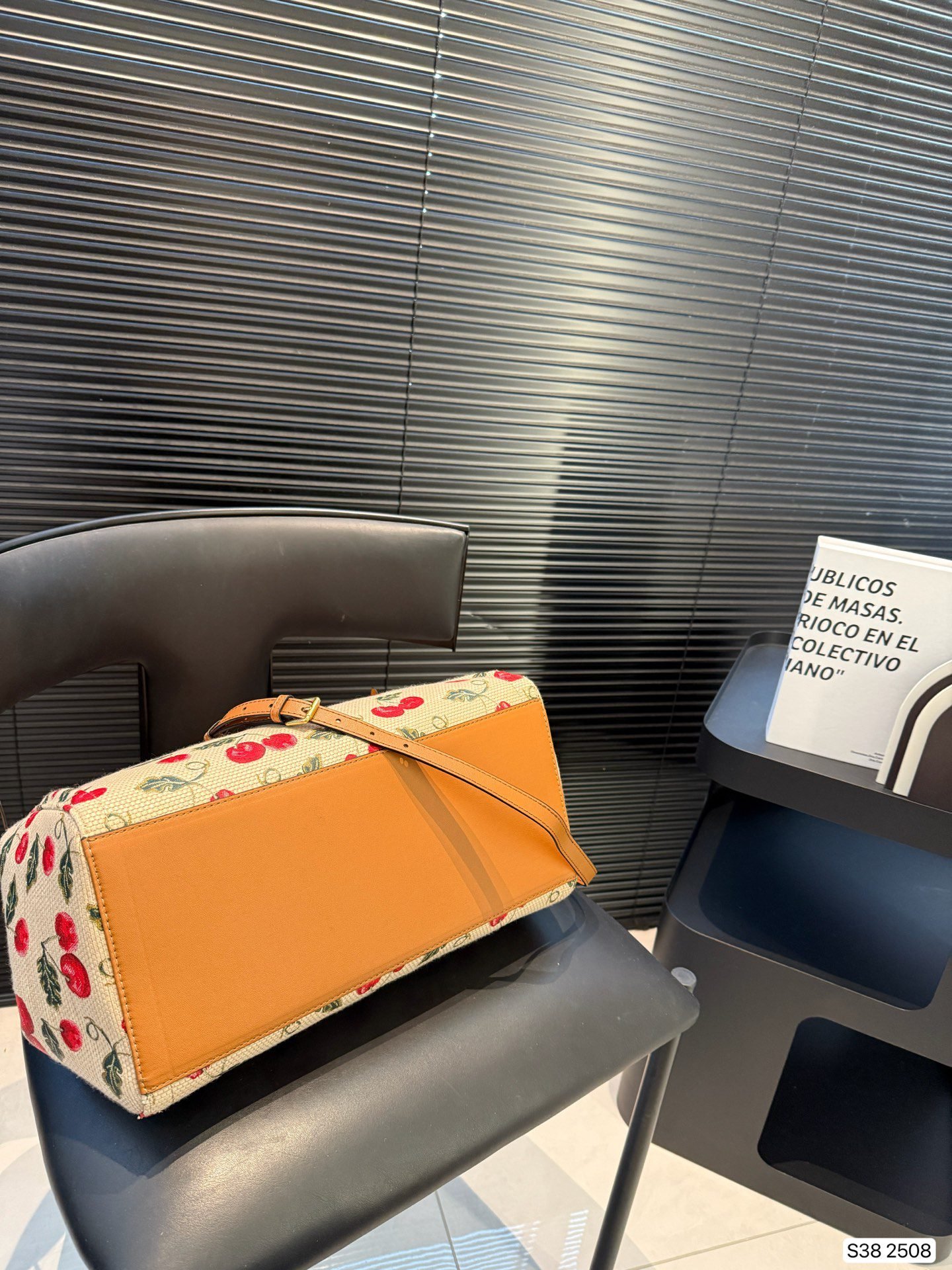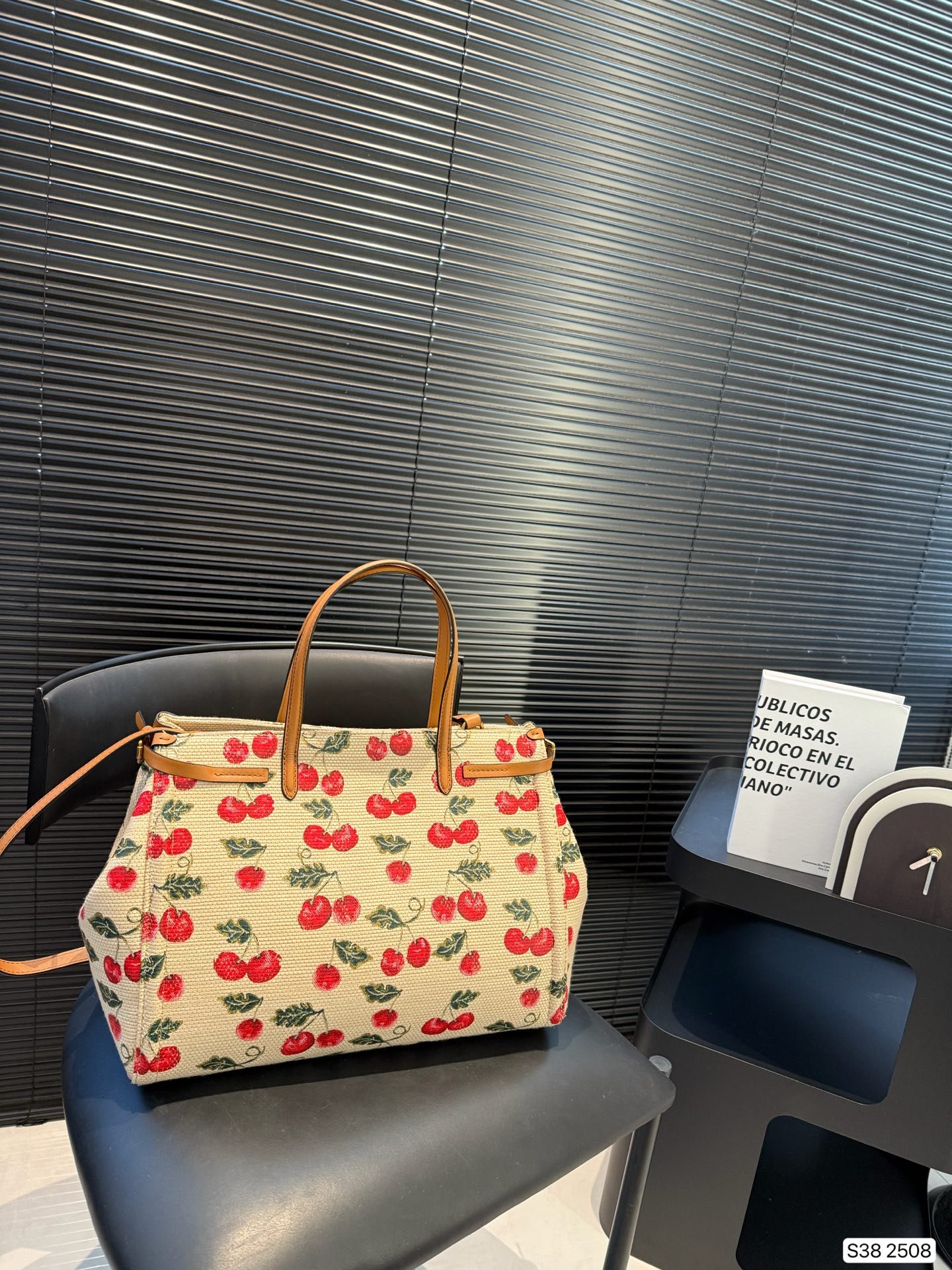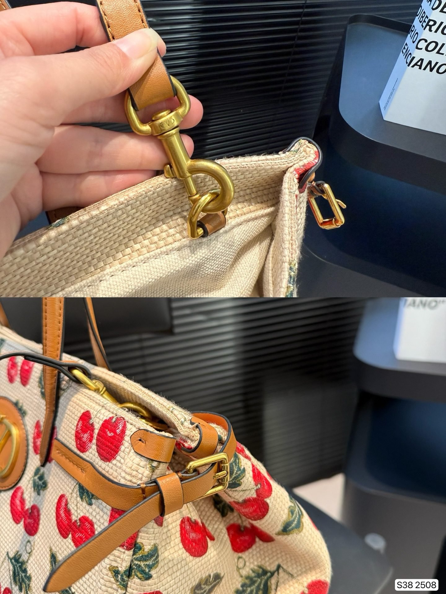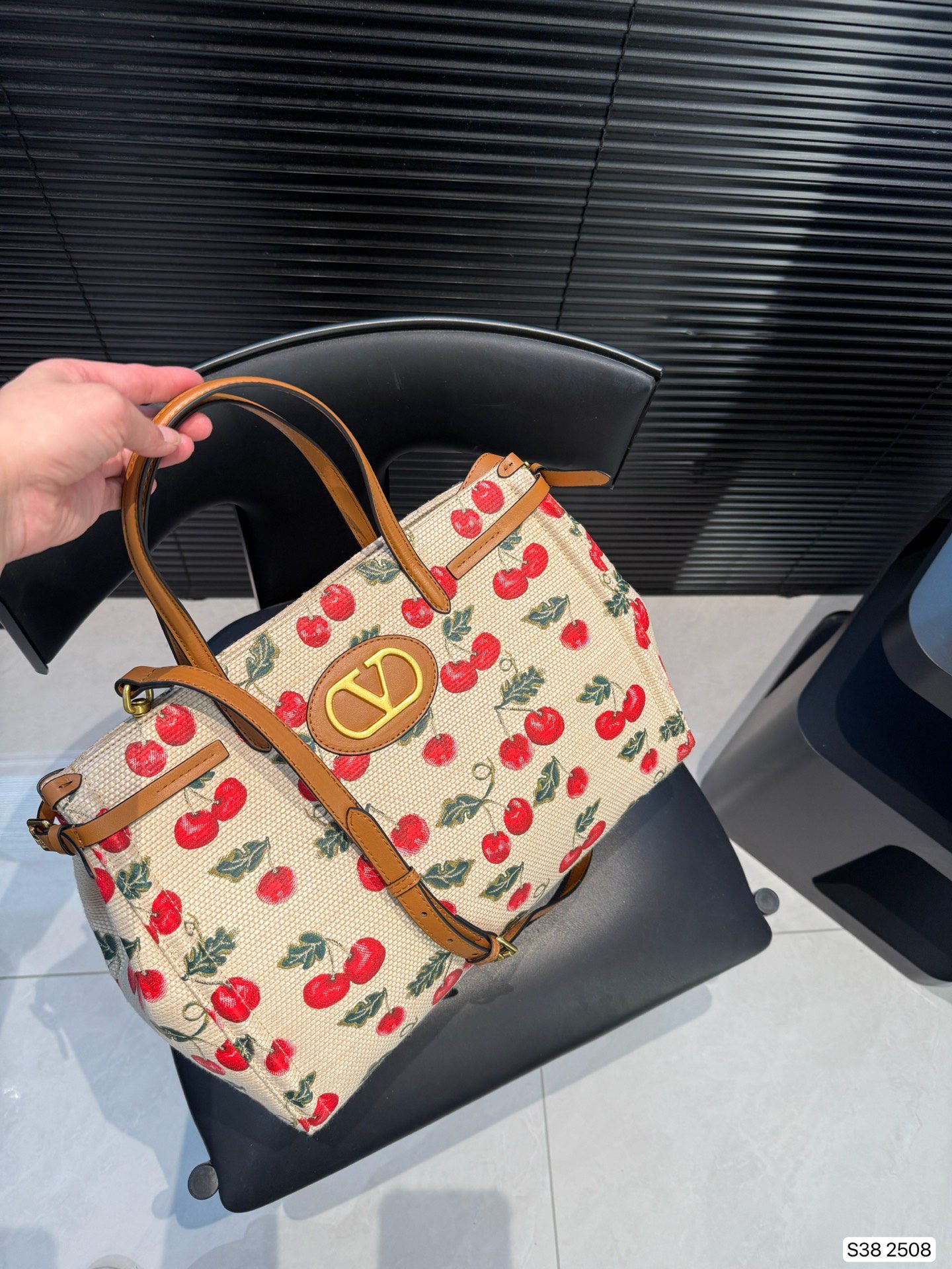 This Valentino cherry-print tote bag features a charming cherry motif on textured fabric, complemented by the iconic V-logo hardware and leather accents, all in a 35×27cm silhouette. Blending whimsical design with luxury craftsmanship, it’s a standout piece for those who love to infuse their style with vibrant, playful details. Perfect for elevating everyday looks or adding a touch of fun to special occasions, this bag embodies Valentino’s ability to merge artistry and sophistication.