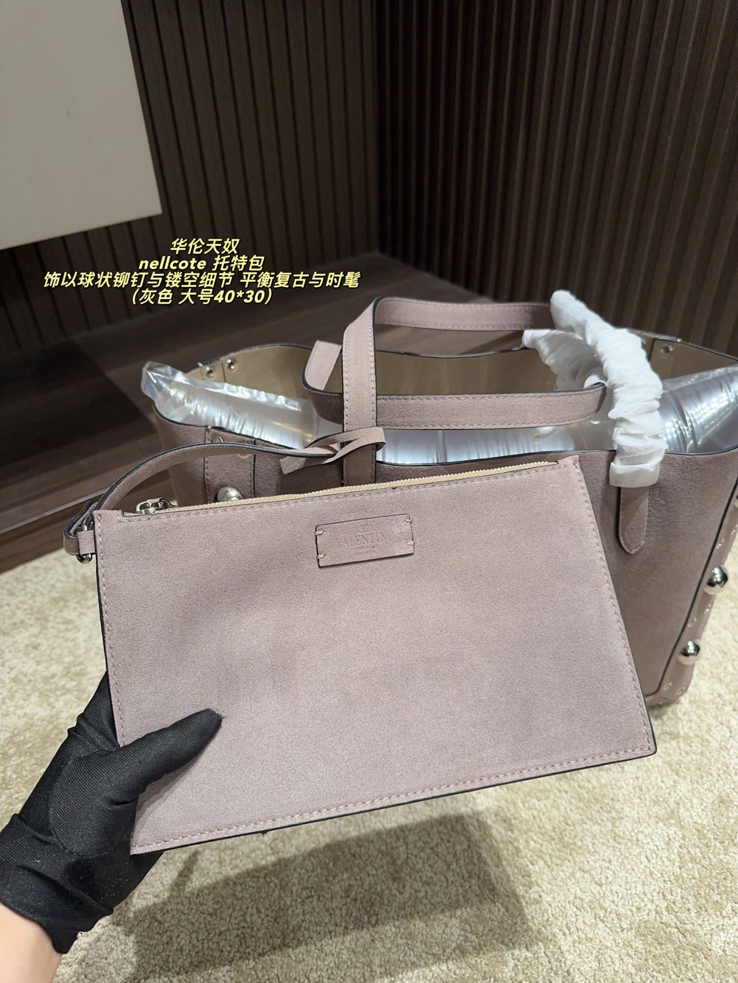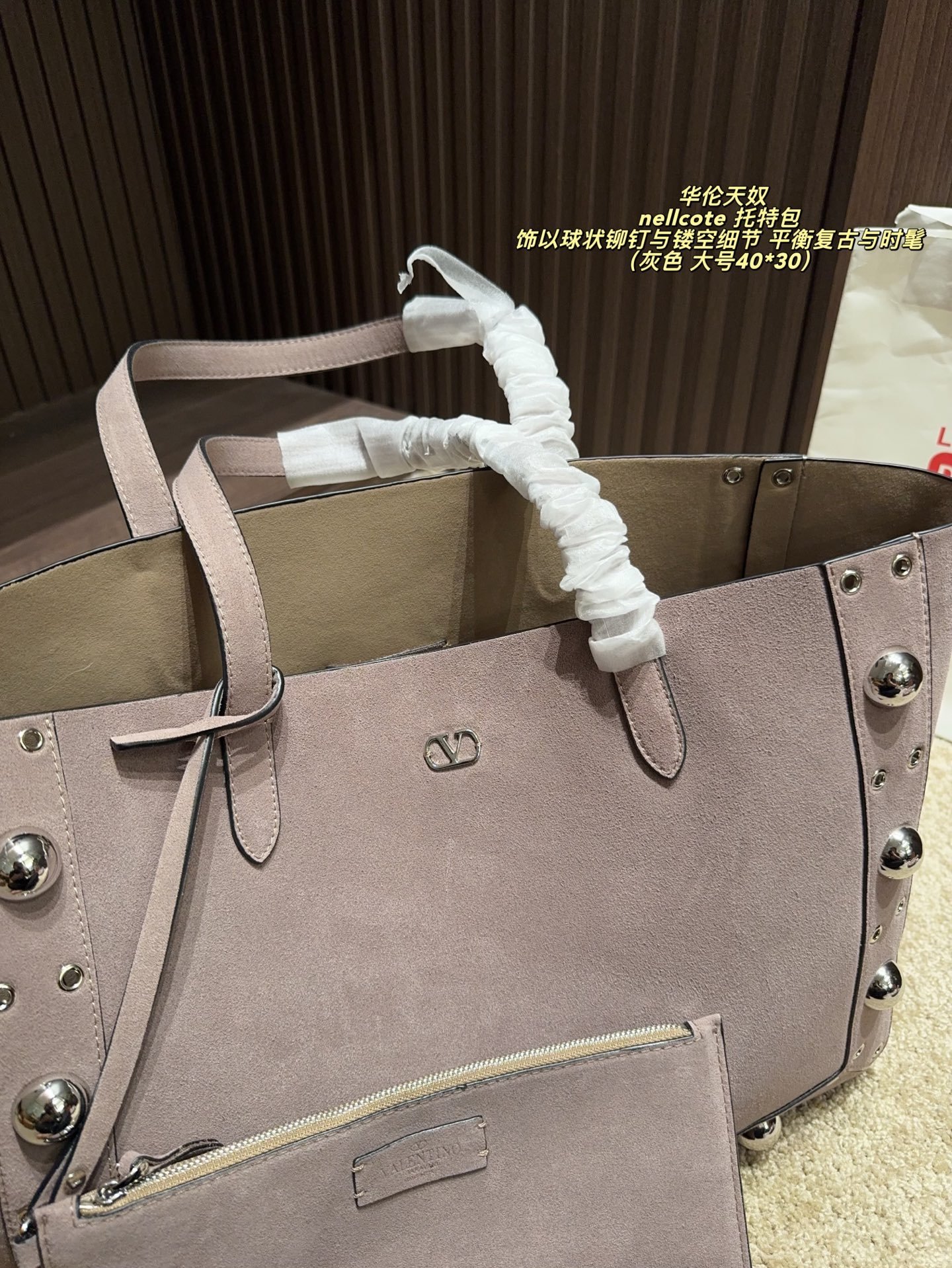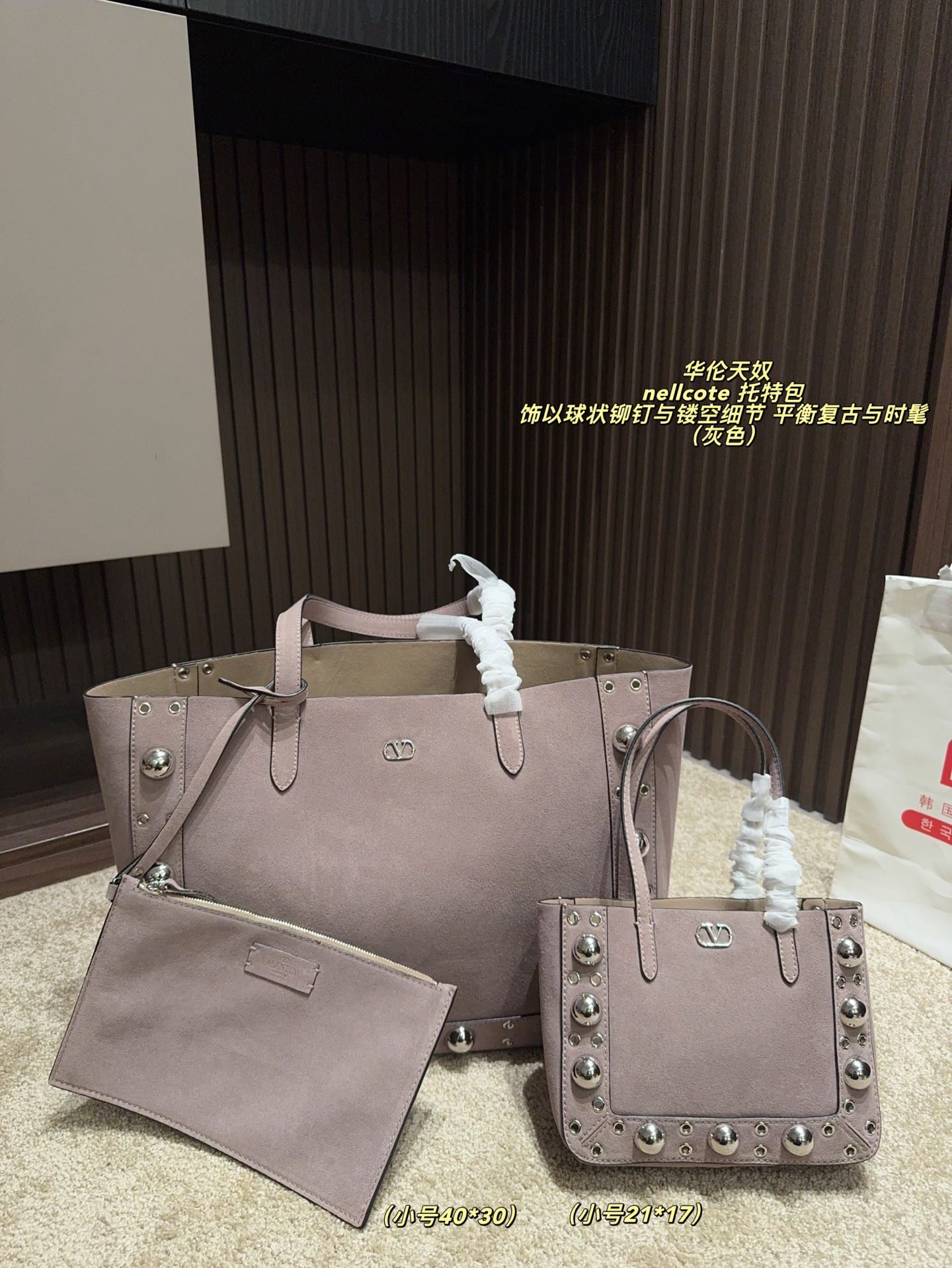 This Valentino Nellcote tote bag collection features sumptuous suede craftsmanship, iconic spherical stud details, and a versatile two-piece set design, available in large (40×30cm) and small (21×17cm) sizes. Blending vintage allure with modern sophistication, these bags strike a perfect balance between retro charm and contemporary style. Ideal for those who crave distinctive, artisanal luxury, they elevate any look with tactile elegance and functional versatility, embodying Valentino’s legacy of innovative design and premium craftsmanship.