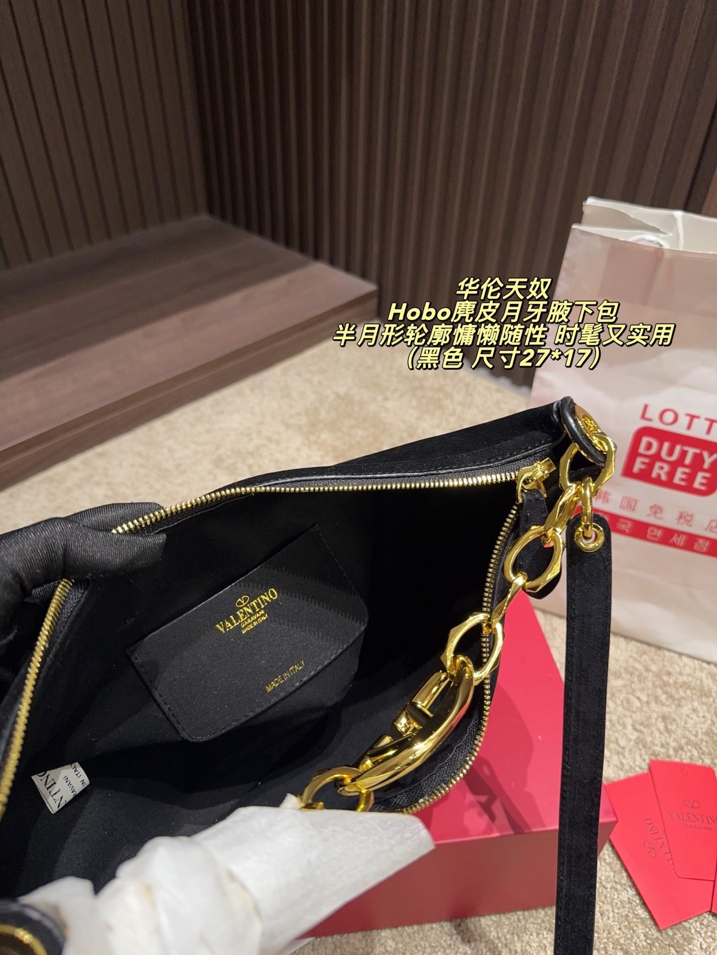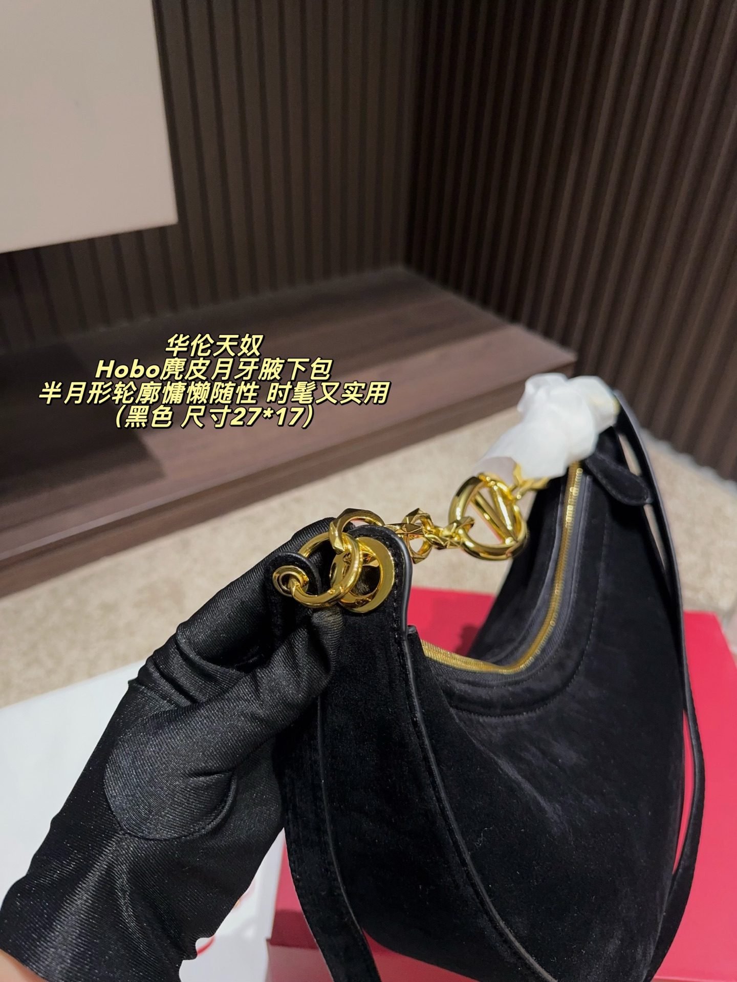 This is Valentino’s iconic crescent bag, centered on the brand’s classic V-shaped metal buckle + chain decoration design. Made of soft suede fabric to create a curved bag body, it combines retro texture and elegant lines; available in multiple colors such as black, brown, and burgundy, suitable for different styling styles. The bag’s capacity fits personal items like phones and cosmetics, and the underarm carrying style fits the body shape. The chain element adds sophistication, fitting daily scenarios like commutes and dates, while infusing a retro light luxury vibe into outfits. It’s a fashionable item that combines beauty and practicality.