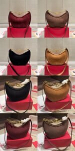This is Valentino’s iconic crescent bag, centered on the brand’s classic V-shaped metal buckle + chain decoration design. Made of soft suede fabric to create a curved bag body, it combines retro texture and elegant lines; available in multiple colors such as black, brown, and burgundy, suitable for different styling styles. The bag’s capacity fits personal items like phones and cosmetics, and the underarm carrying style fits the body shape. The chain element adds sophistication, fitting daily scenarios like commutes and dates, while infusing a retro light luxury vibe into outfits. It’s a fashionable item that combines beauty and practicality.