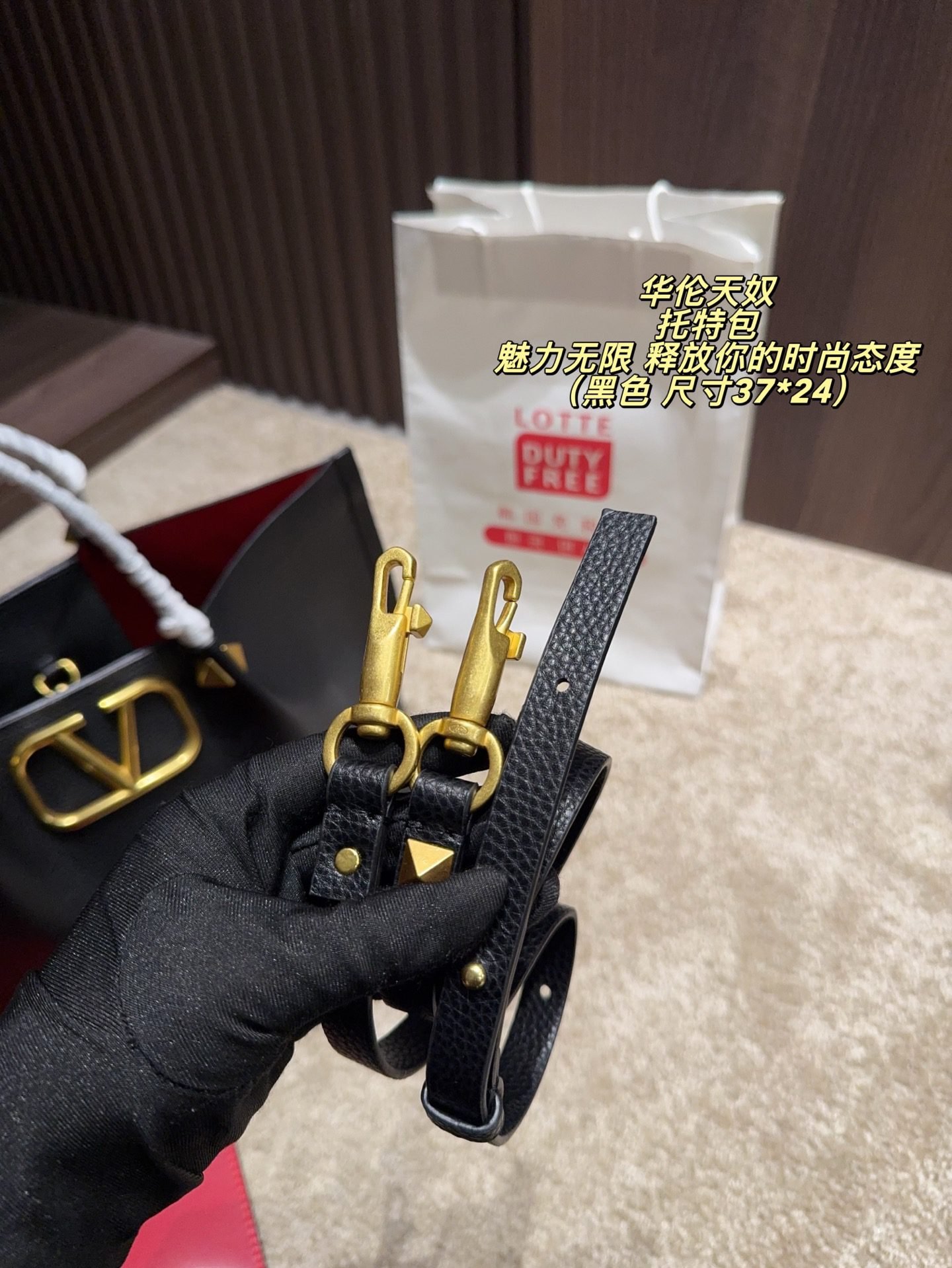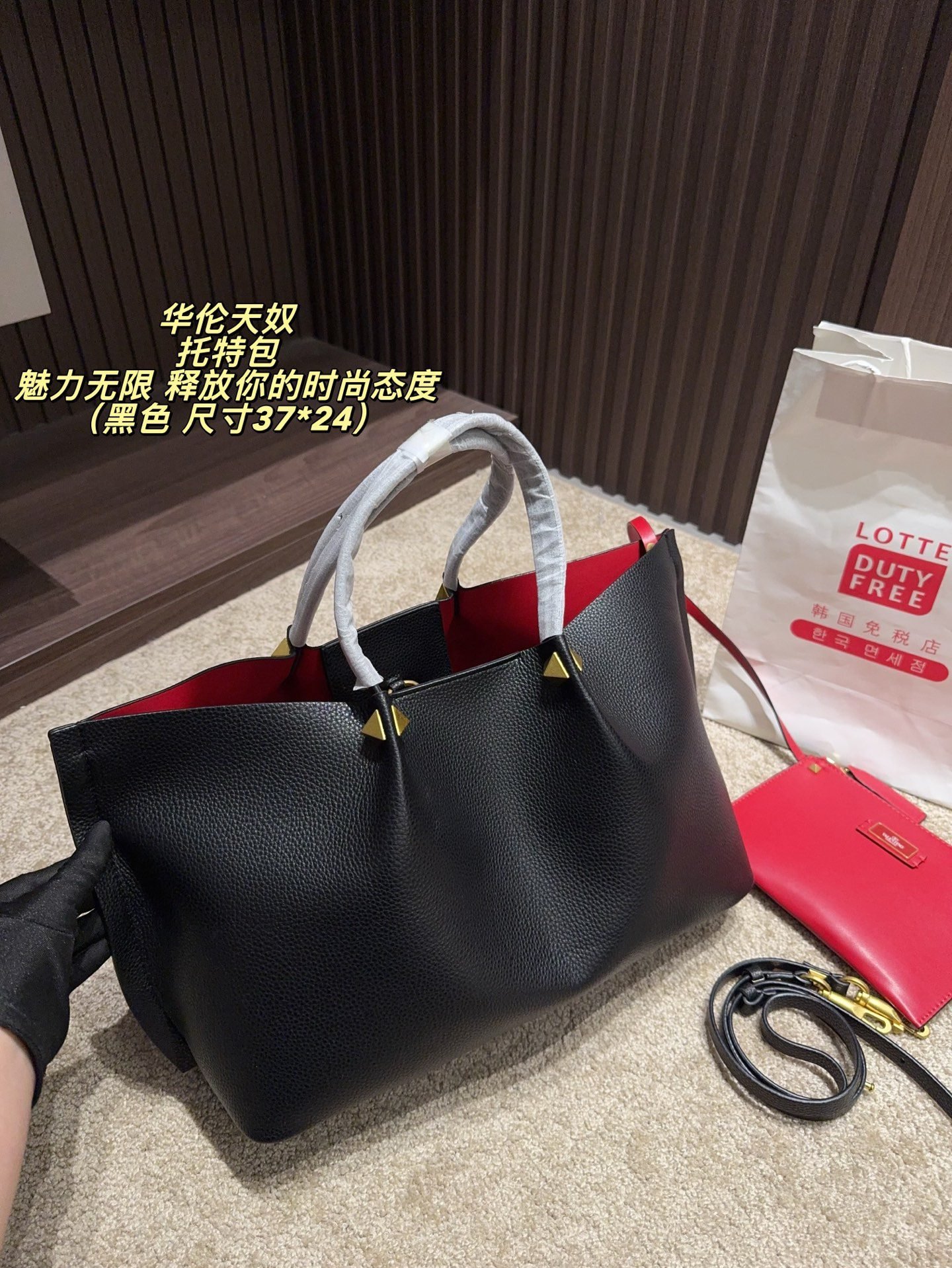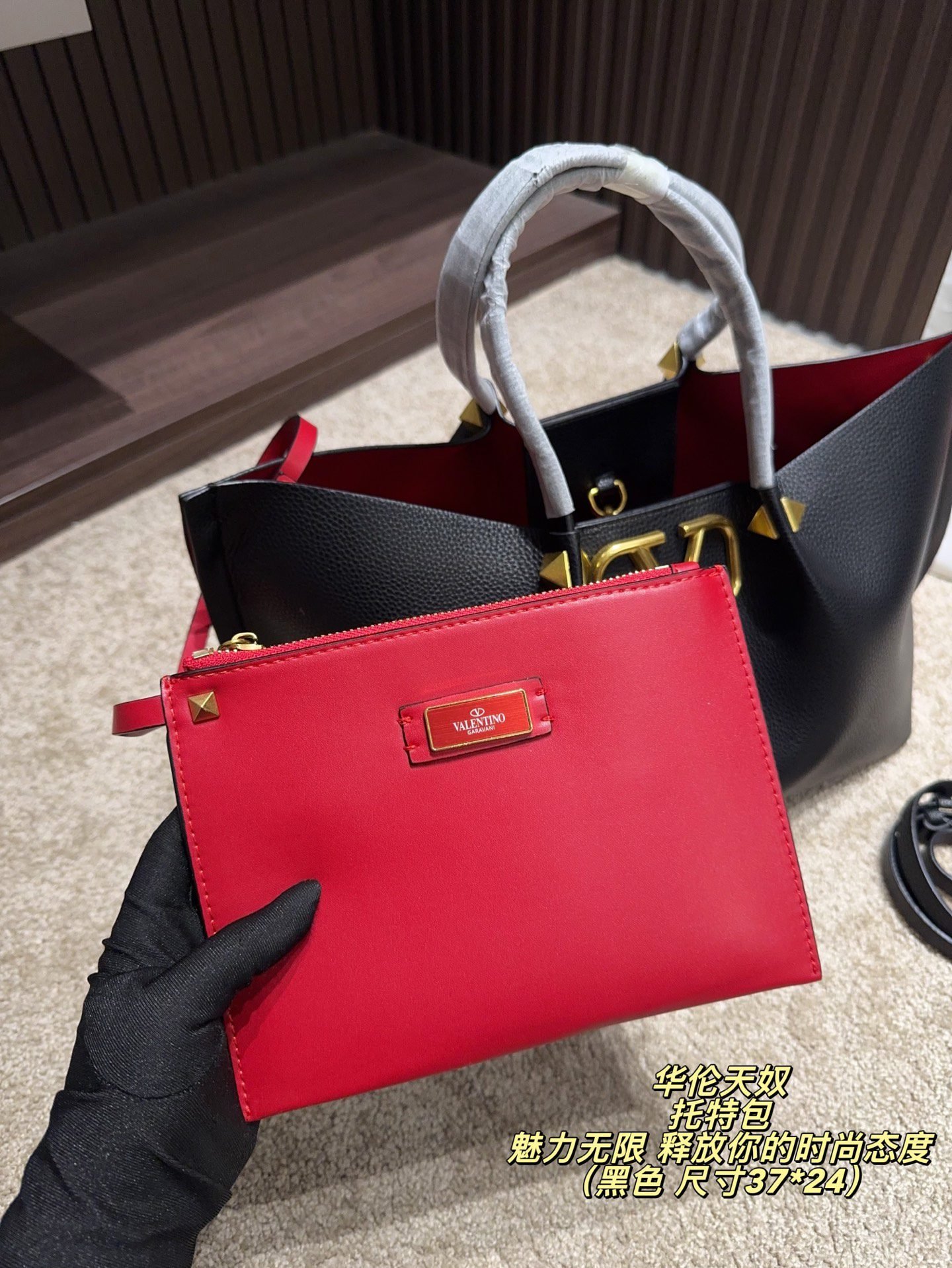This is the Valentino V-logo tote bag set, centered on the brand’s classic V-shaped metal buckle design. The main bag is made of delicate leather, paired with a matching red coin purse, combining practicality and styling coherence; available in multiple colors such as burgundy, nude pink, and brown, suitable for different styling styles. The main bag (37*24cm) has a large capacity to hold commuting items like laptops and documents, supporting hand-held and shoulder carrying; the coin purse can store change and cards. It’s a light luxury practical set for daily commutes and outings, with a minimalist and premium design that easily enhances styling texture.