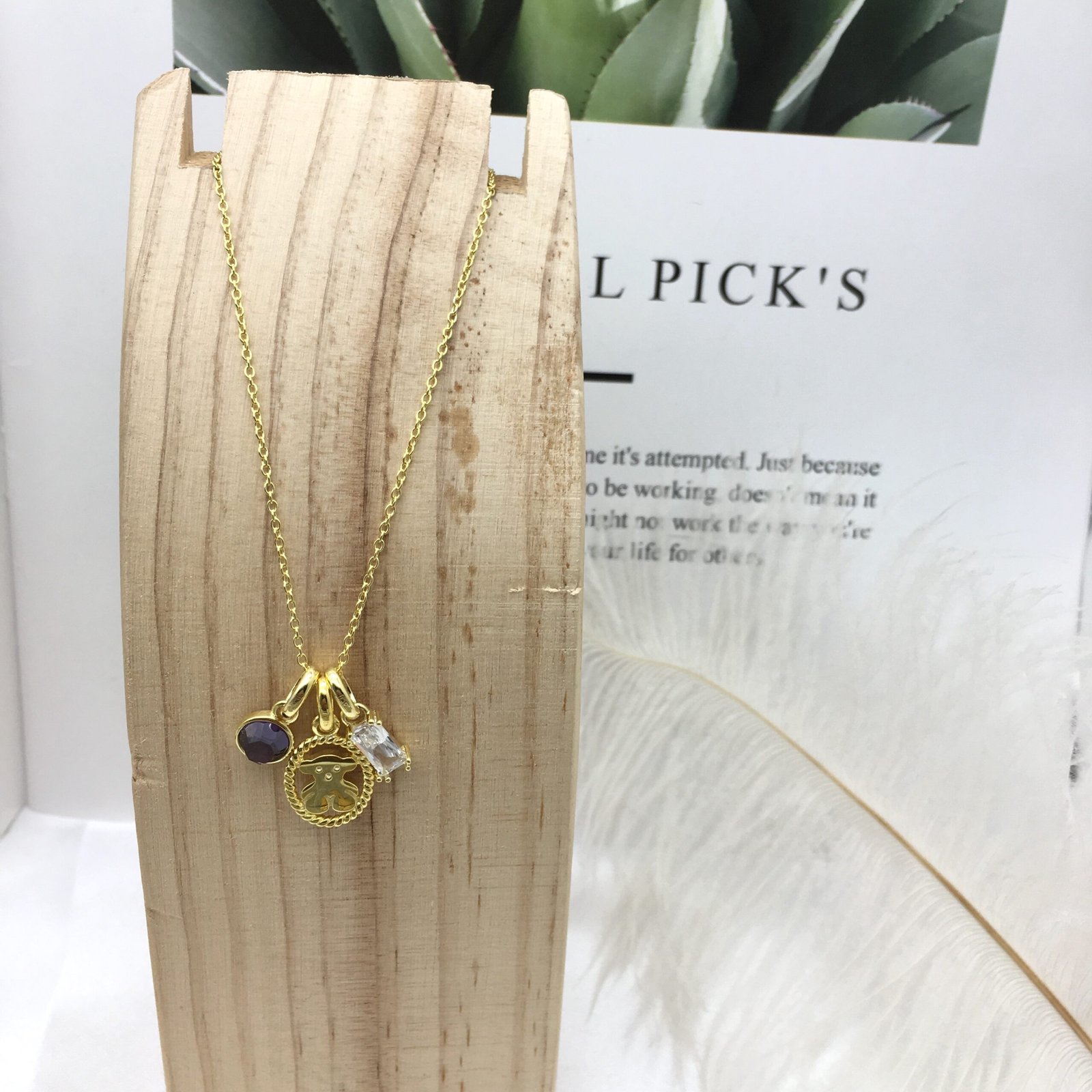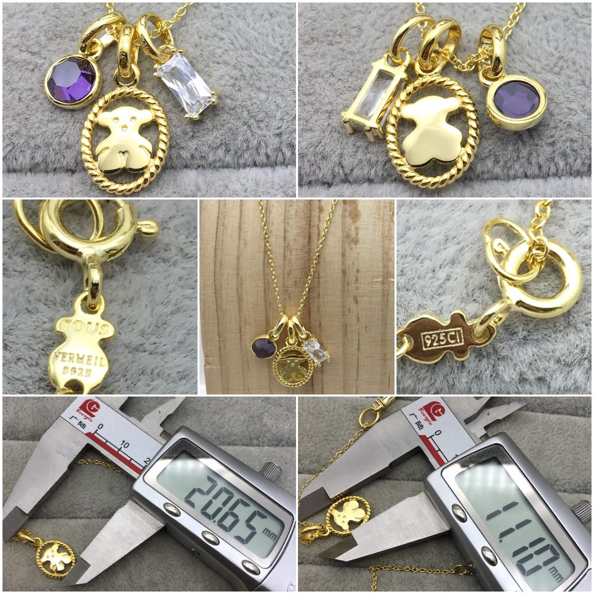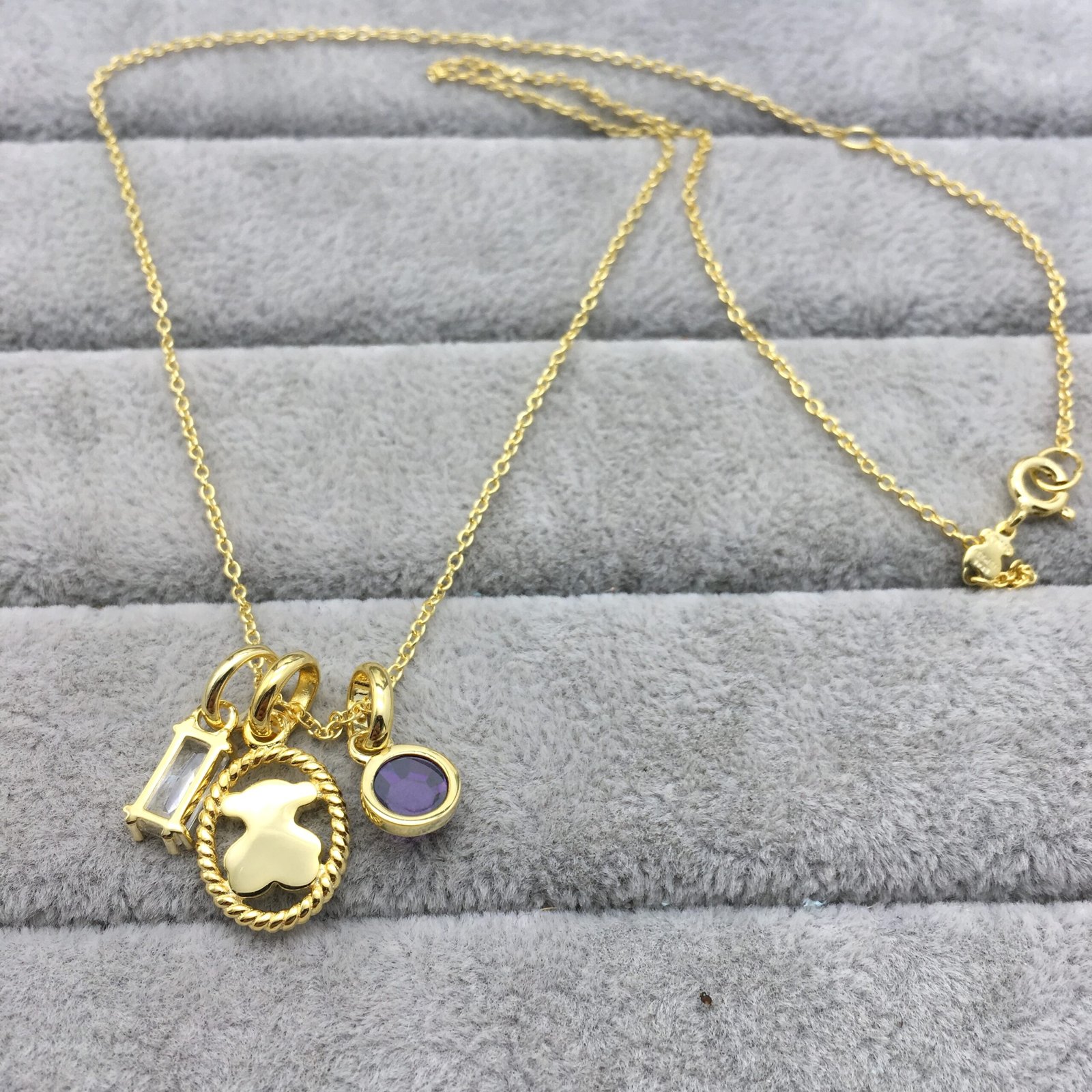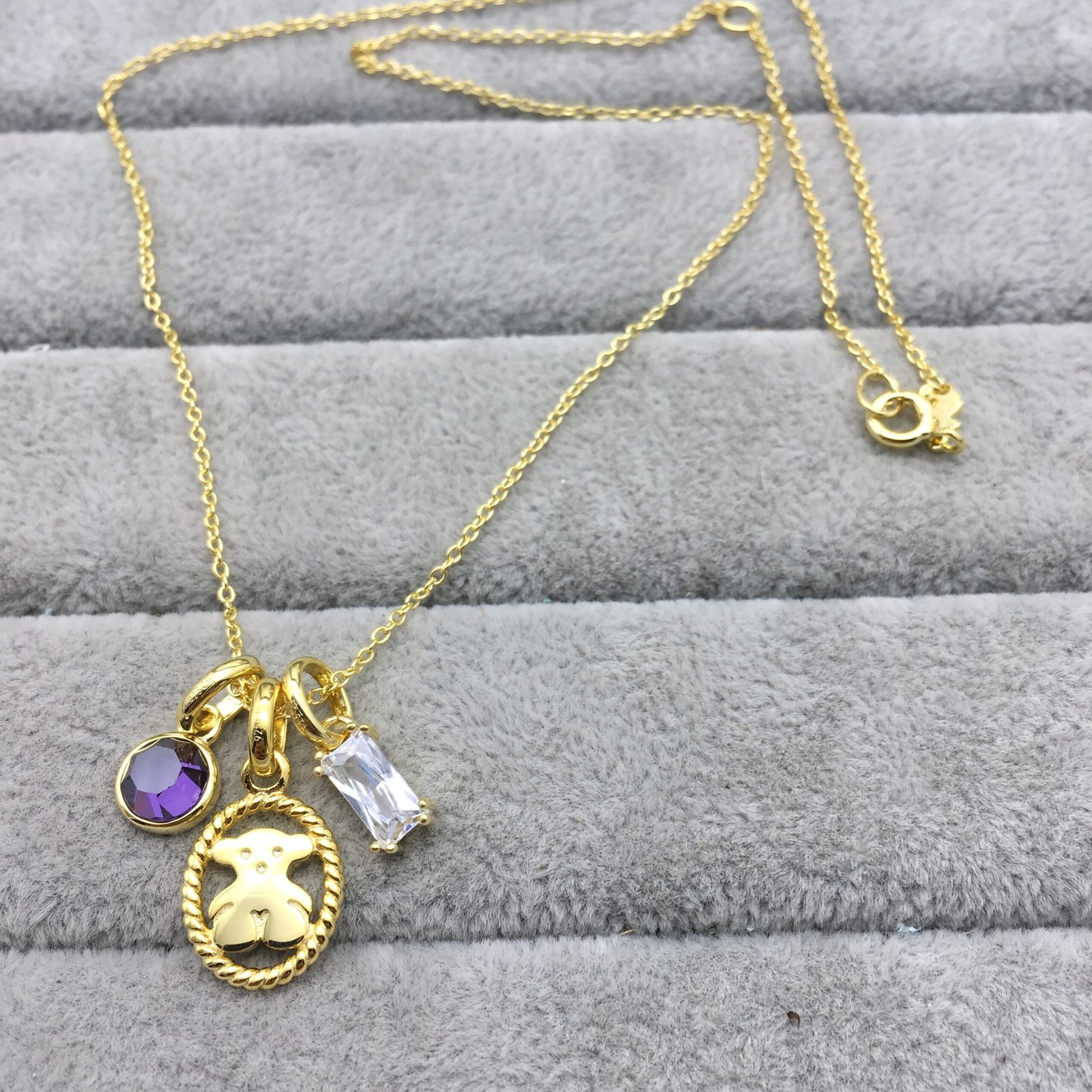 What is our bear doing between an amethyst and a praseolite? This necklace with its pretty pendants certainly does shine.