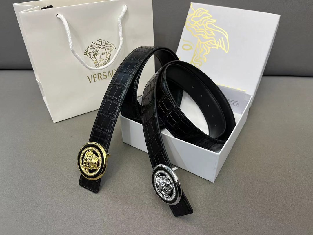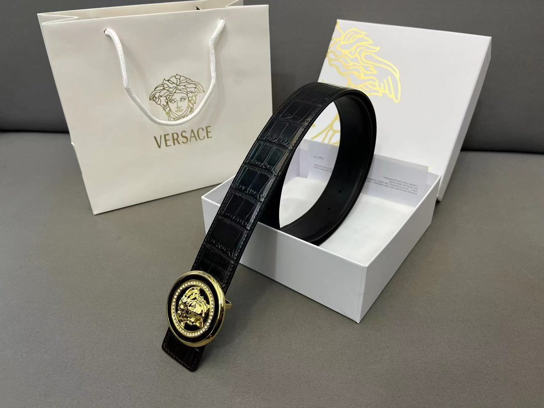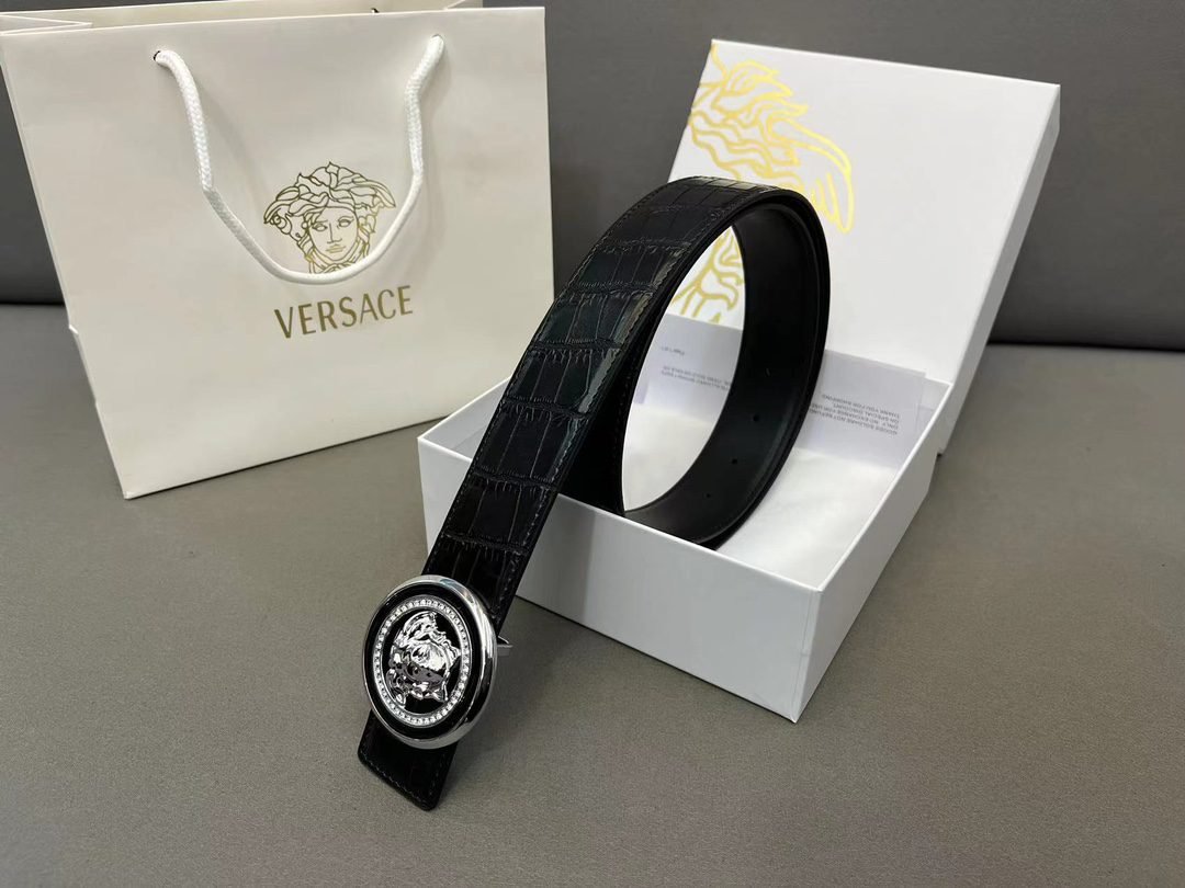 Versace Classic Circular Buckle Black Crocodile Pattern Belt Simple, Grand, Noble, Luxury