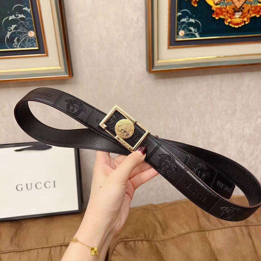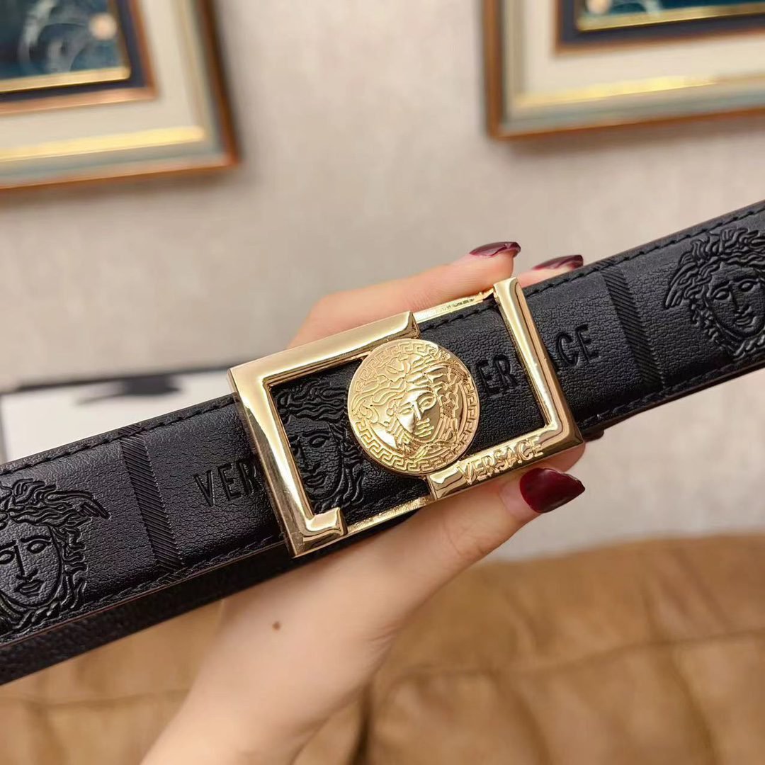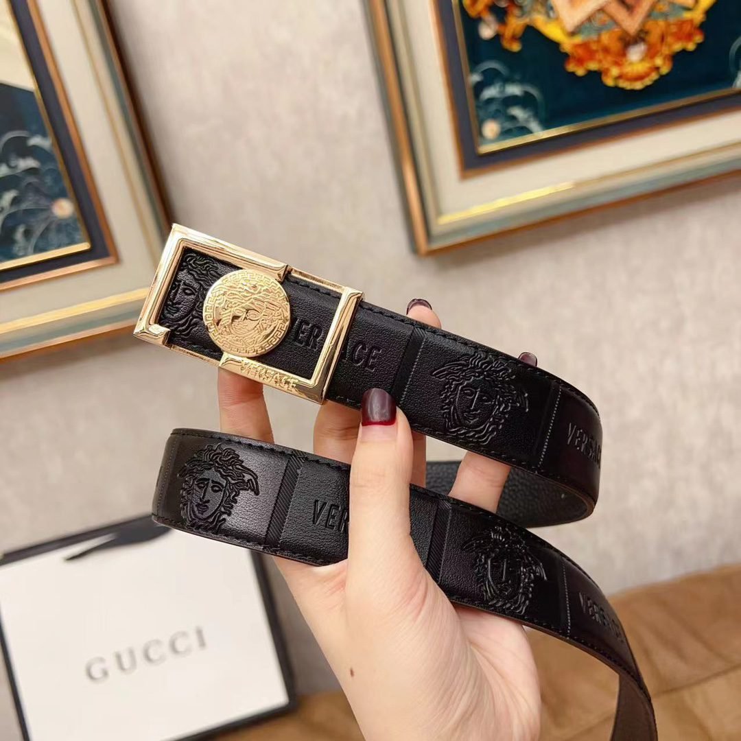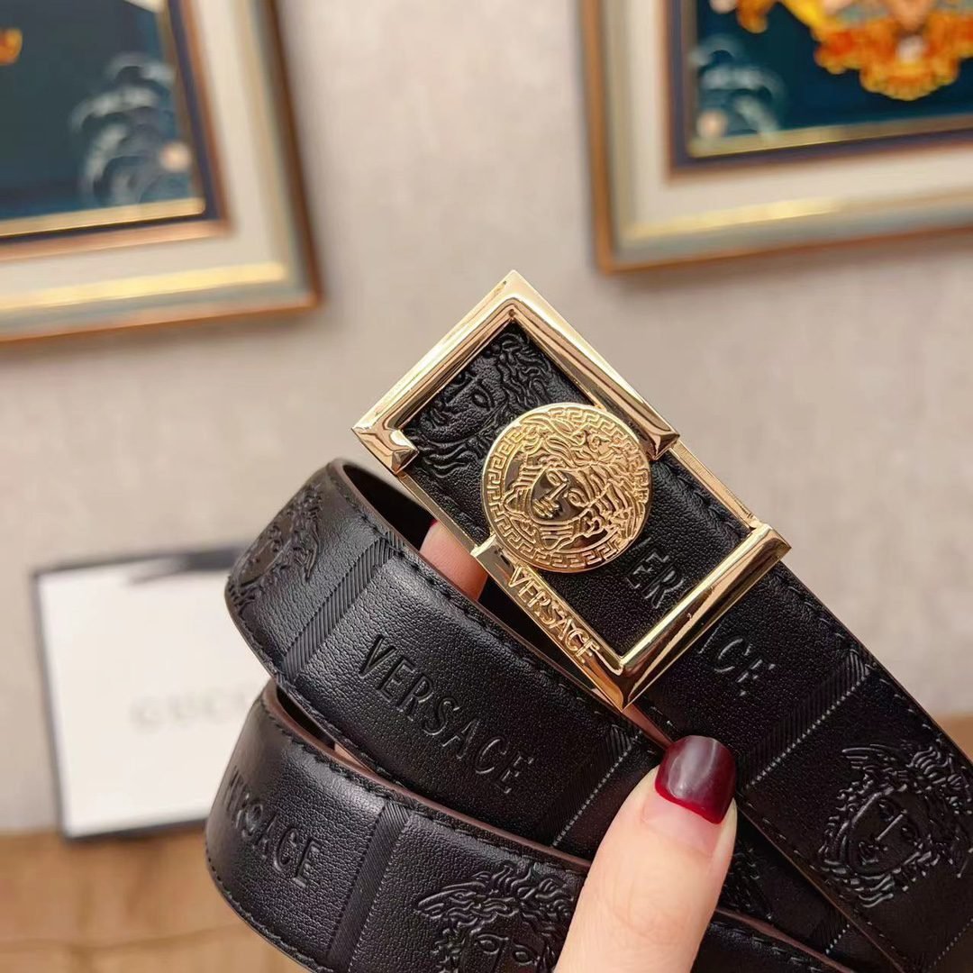Versace gold square buckle with black texture belt, simple, atmospheric, exquisite and elegant