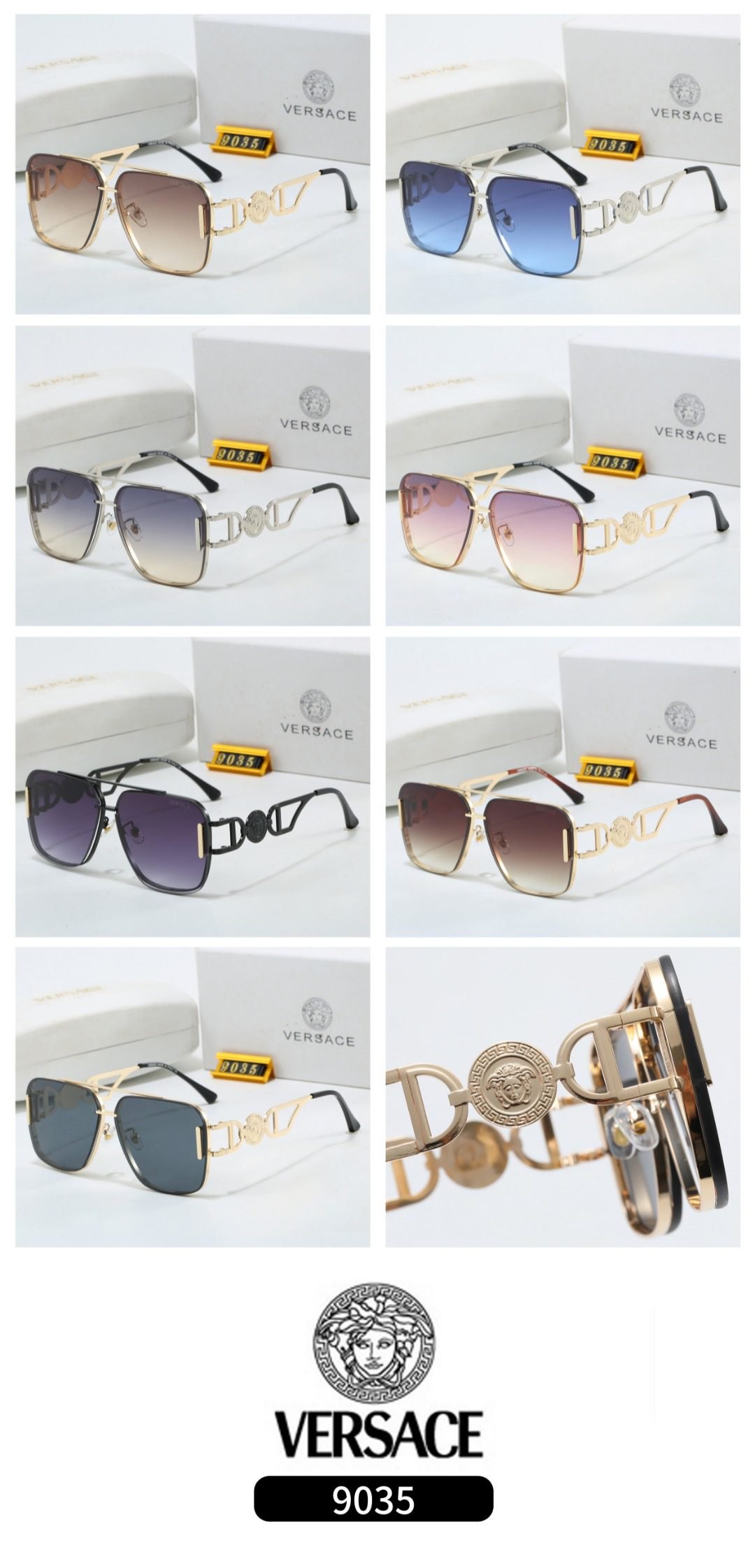 Elevate your style with Versace Model 9035 sunglasses. Featuring a square frame design and the iconic Medusa head detail, these sunglasses come in a variety of stunning color combinations—from gold – brown to silver – blue, and black – purple to gold – pink. Crafted with premium materials, they not only provide excellent sun protection but also exude luxury and fashion. Whether you’re strolling through the city or heading to a glamorous event, these Versace sunglasses effortlessly blend sophistication and trendiness, making you stand out in any crowd.