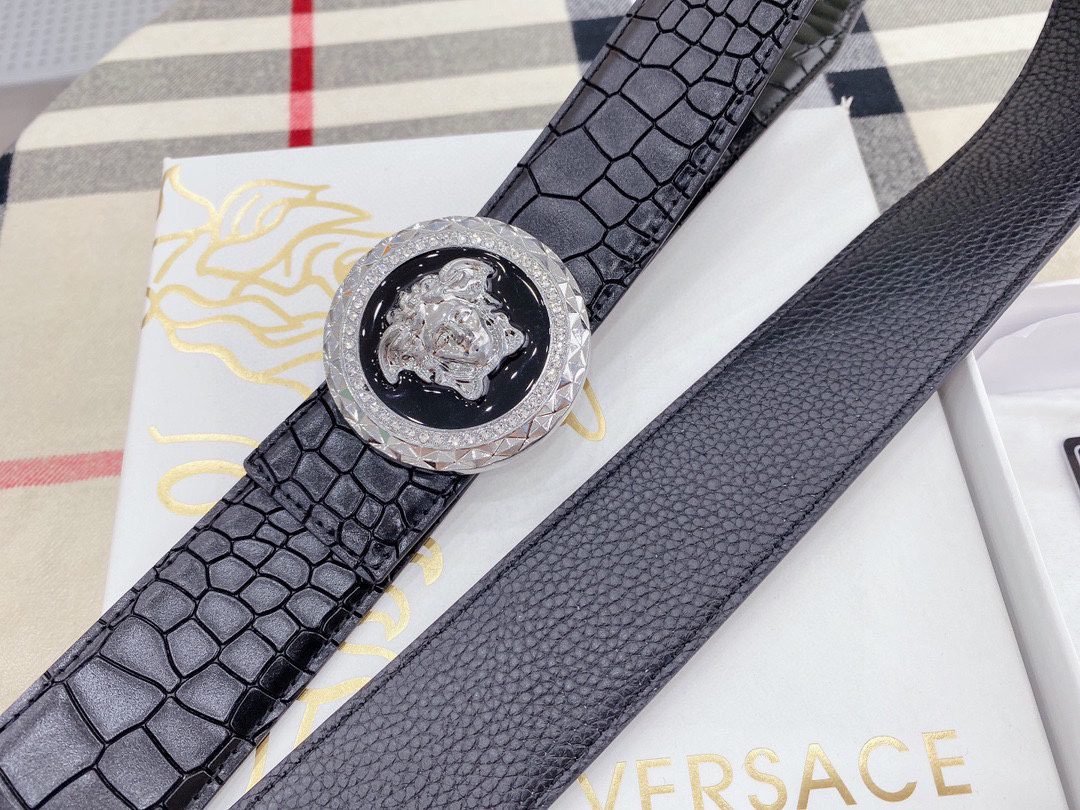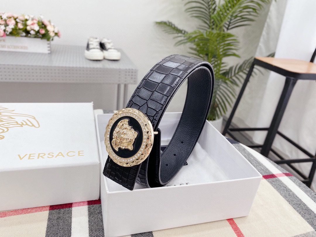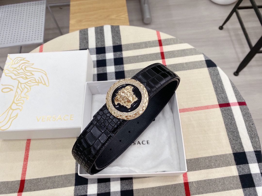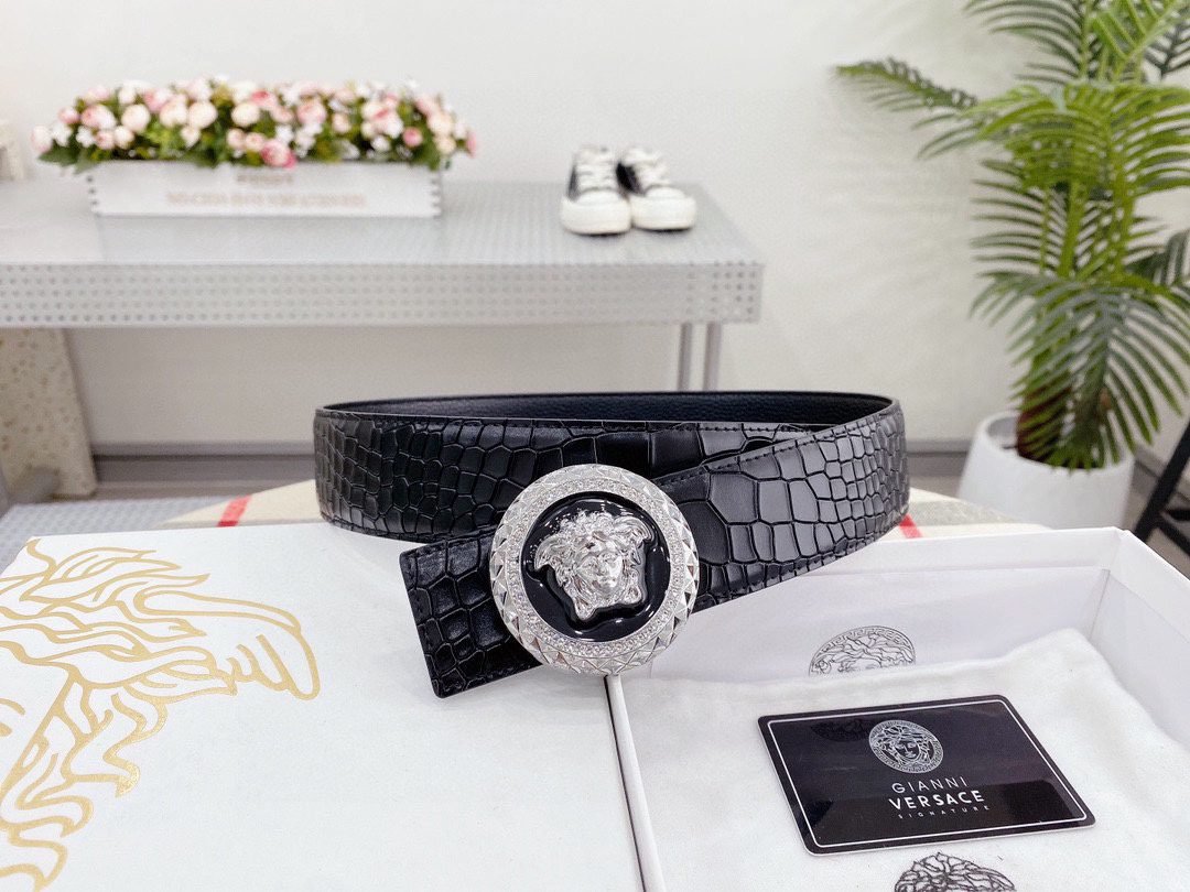 Home Belt VERSACE Belt Versace Round Buckle Black Crocodile Pattern Belt, Simple and Elegant, Low key Luxury