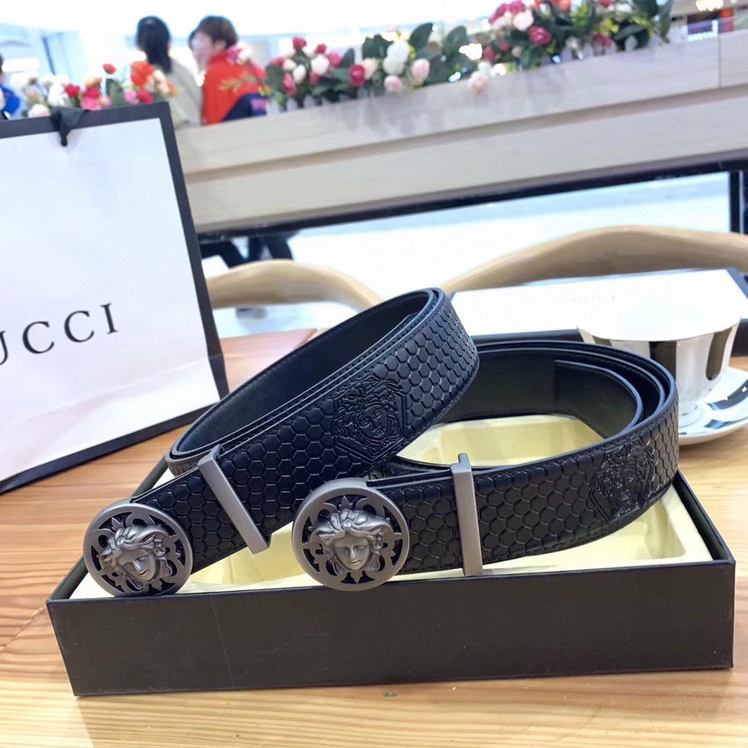 Home Belt VERSACE Belt Versace Silver Round Buckle Black Texture Belt Classic Fashion Low key Luxury