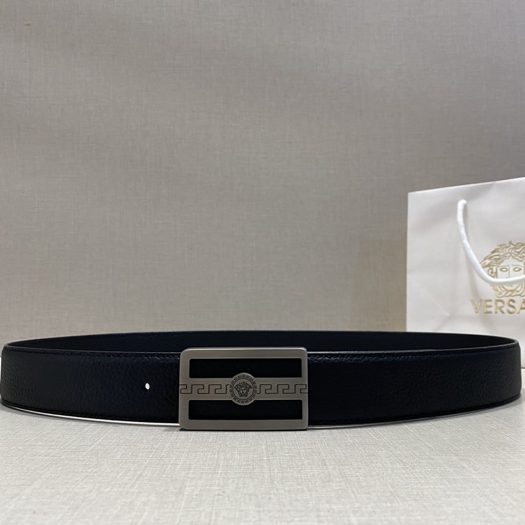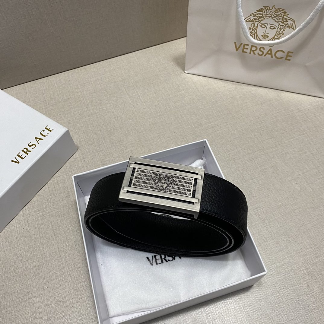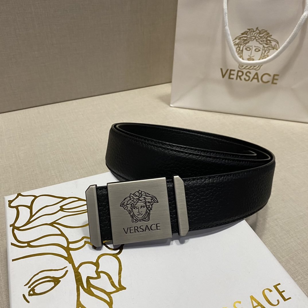 Versace Silver Square Buckle Black Belt Simple and Elegant, Low key Luxury