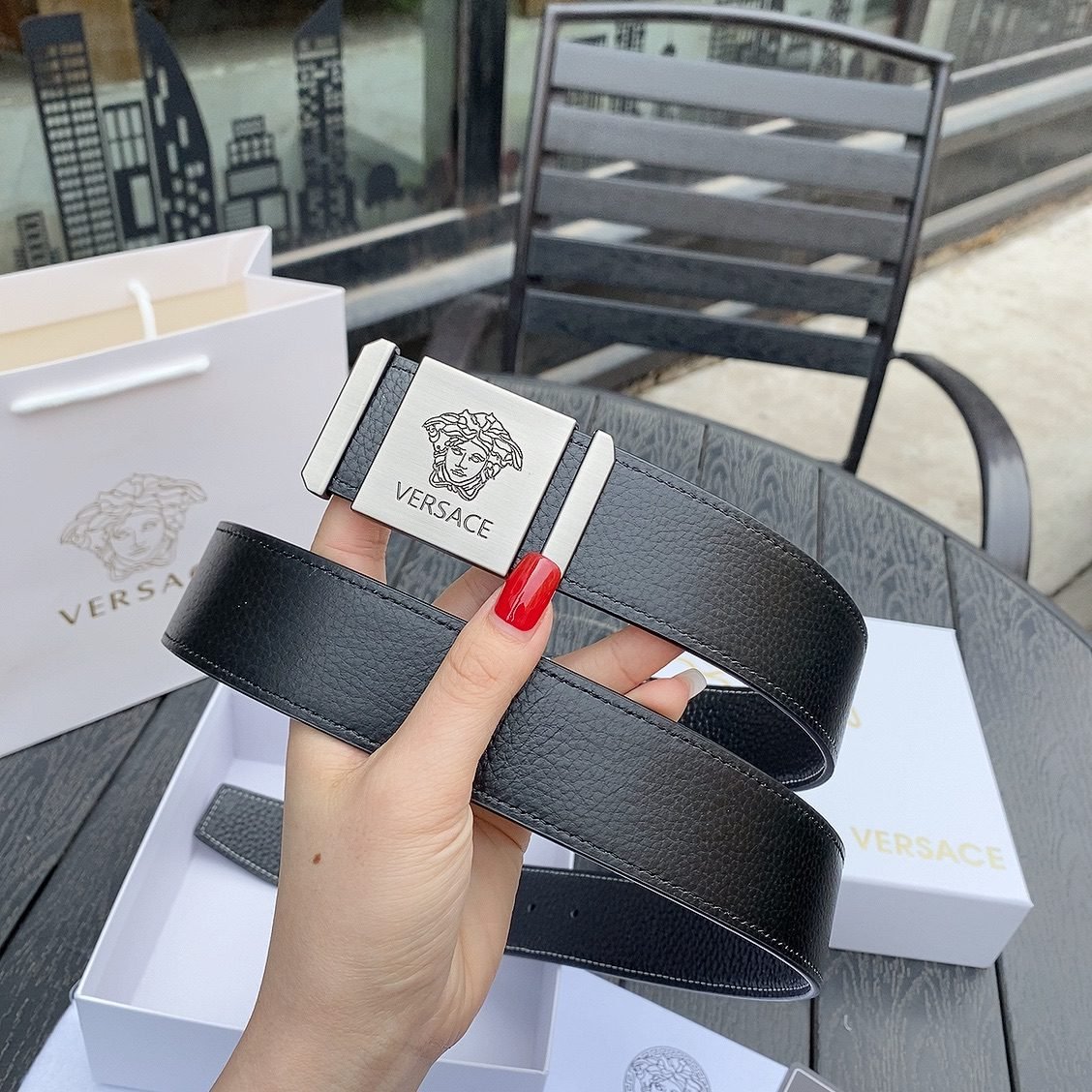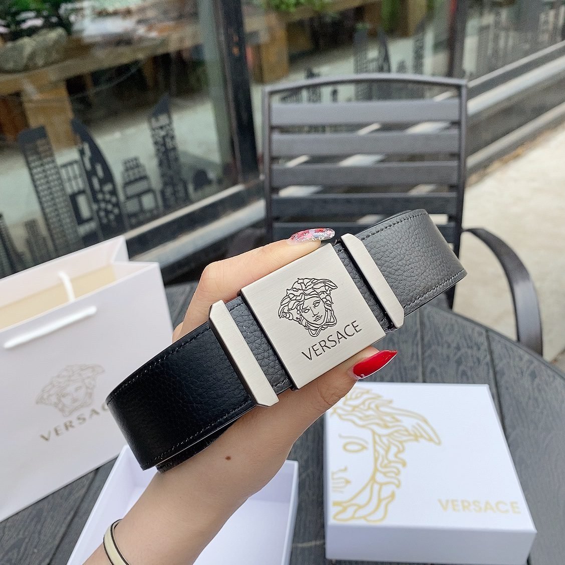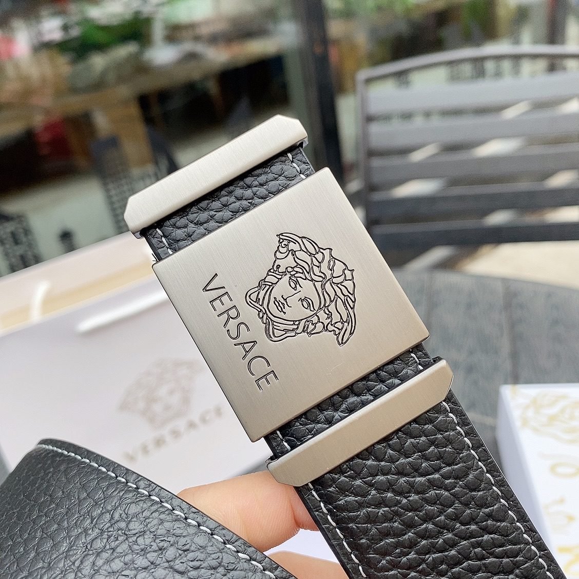 2.Classic design: The belt buckle is engraved with the “VERSACE” logo, showcasing the brand’s unique charm.