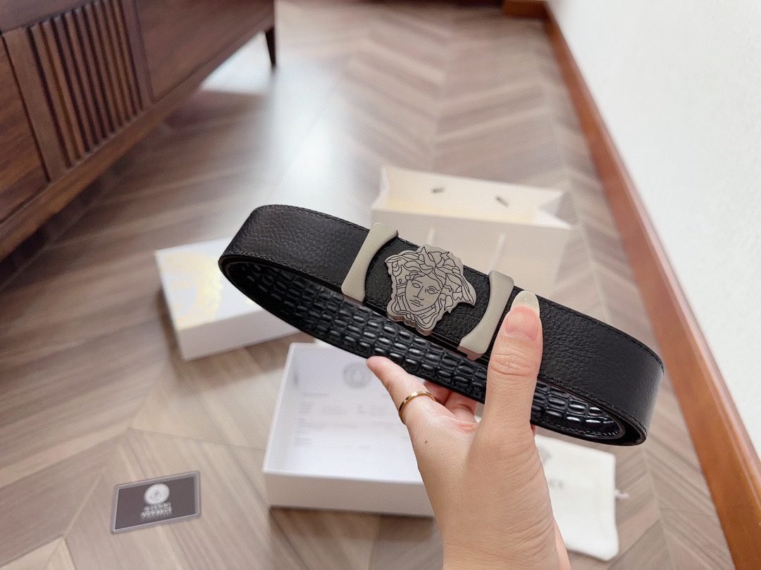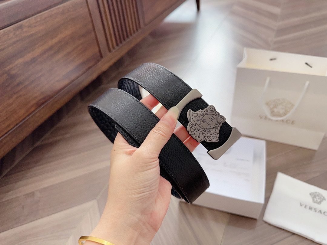 Versace silver square buckle black belt, simple, atmospheric, exquisite and elegant