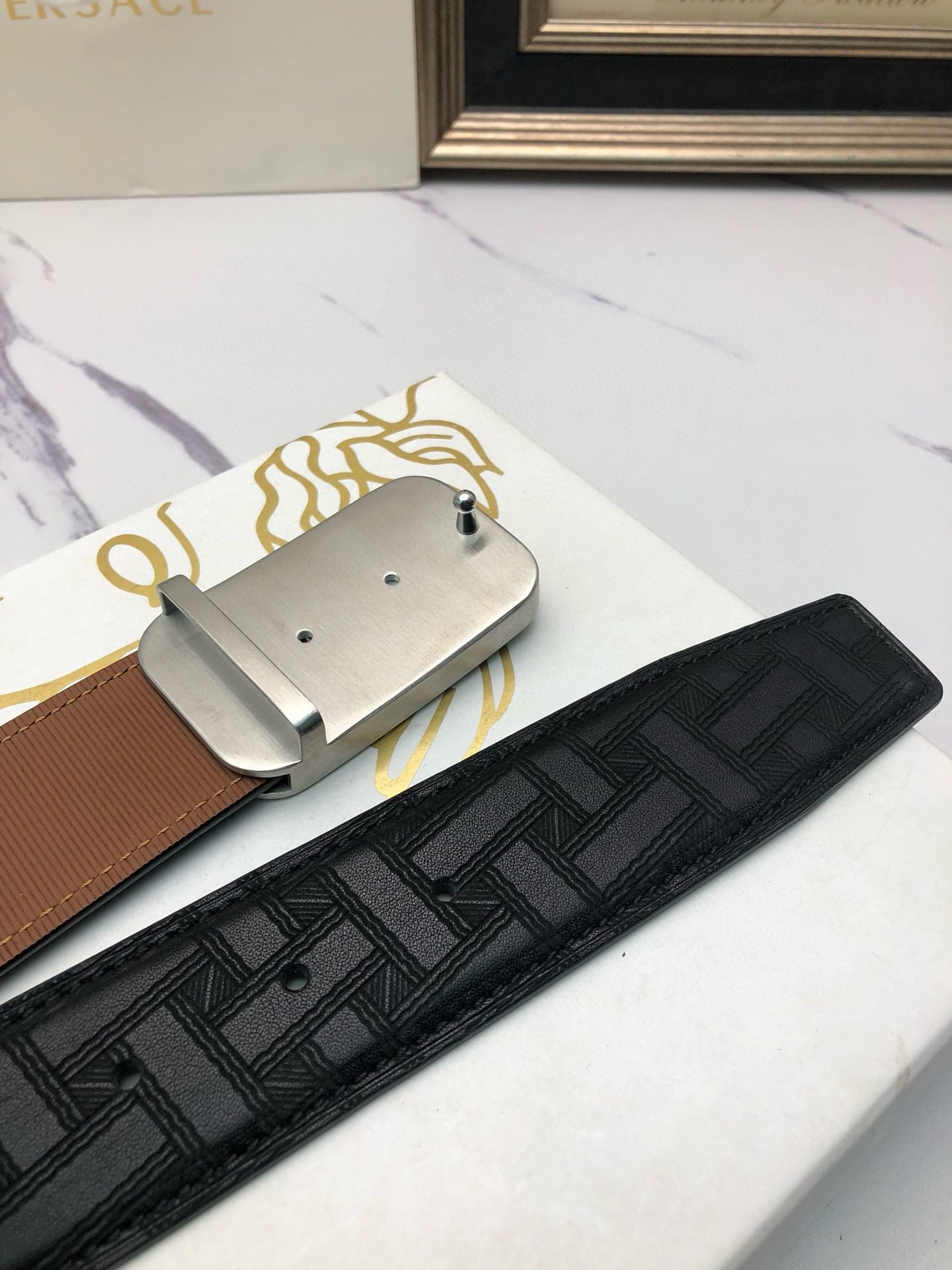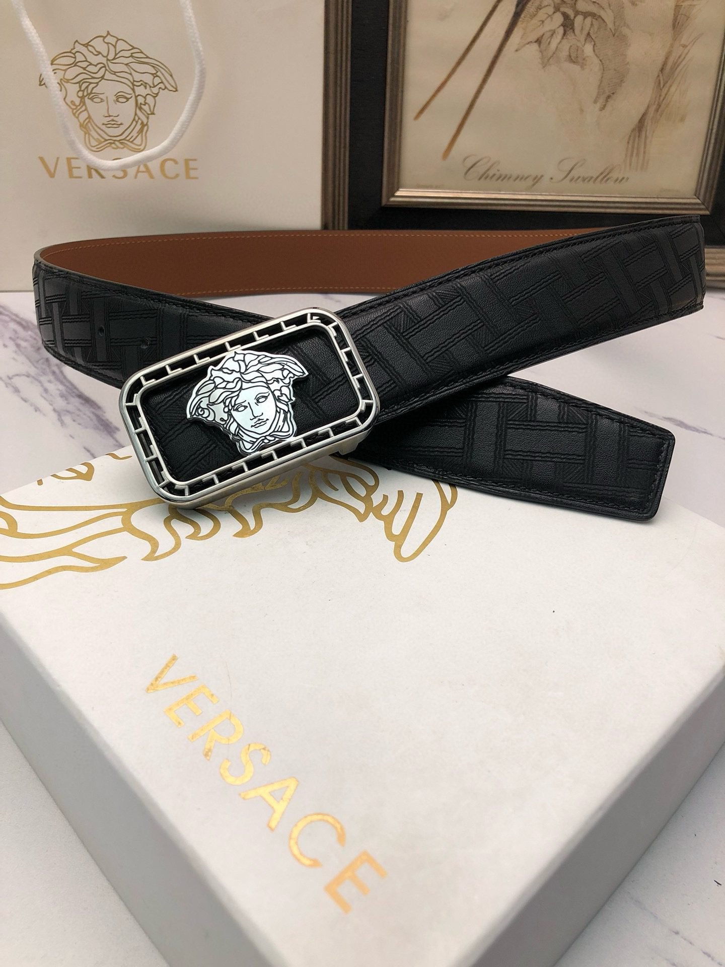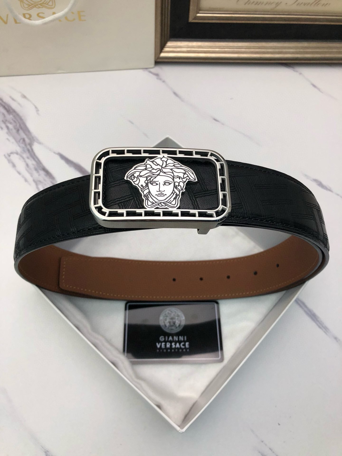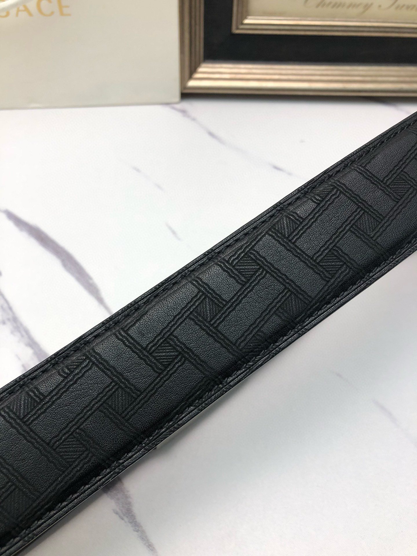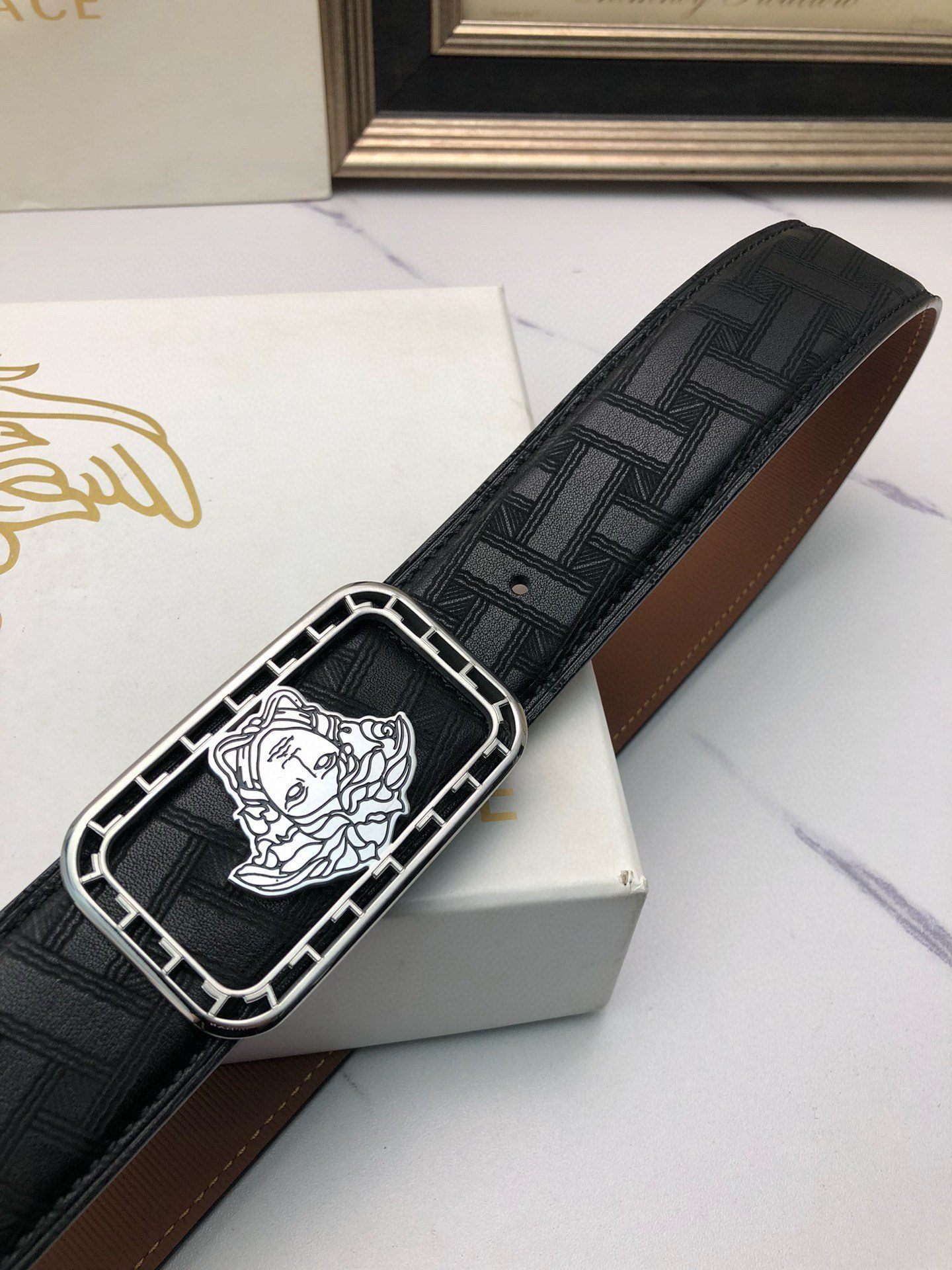 Be the first to review “Versace Silver Square Buckle Black Texture Belt Classic Fashion Low key Luxury” Cancel reply