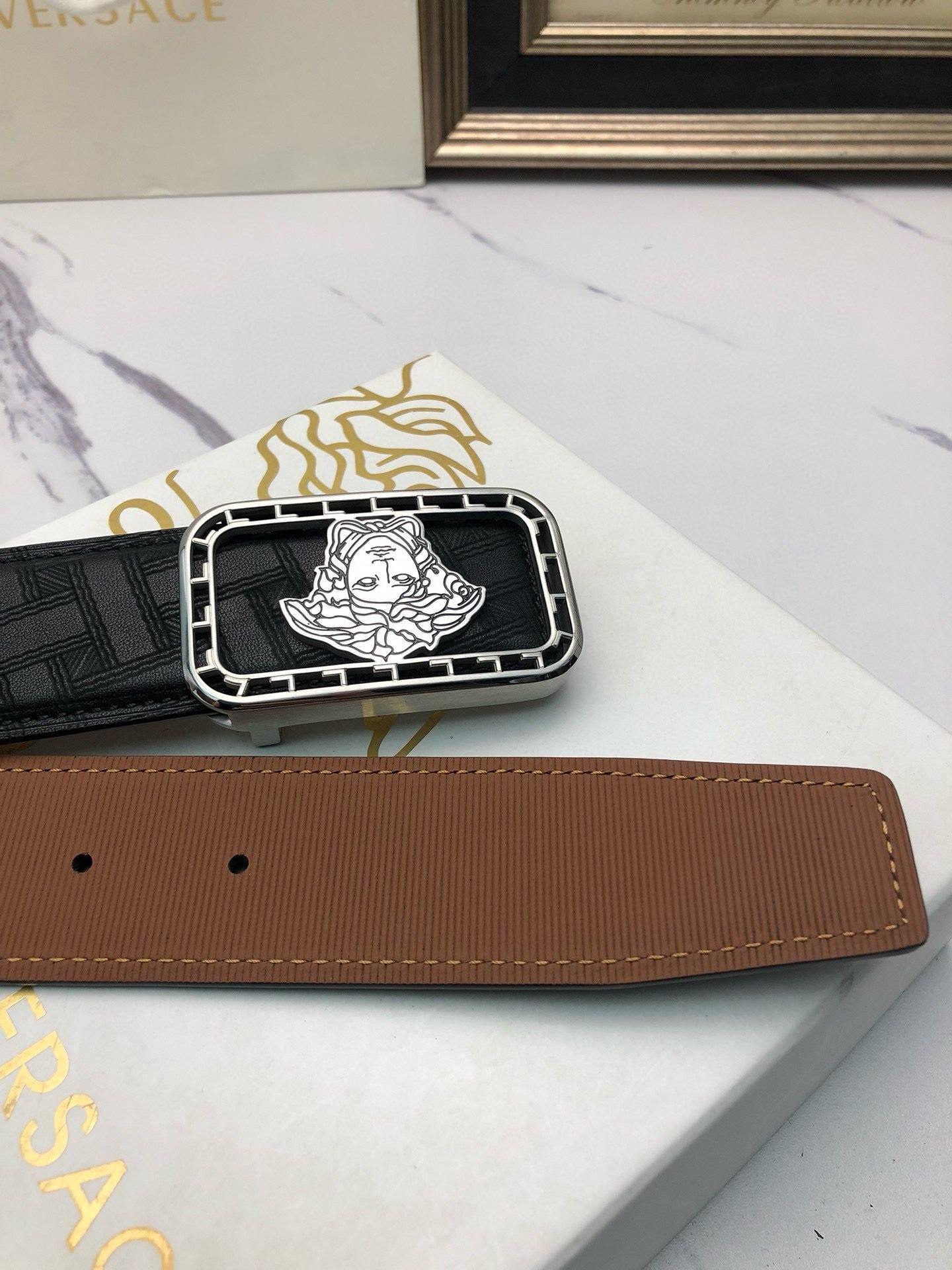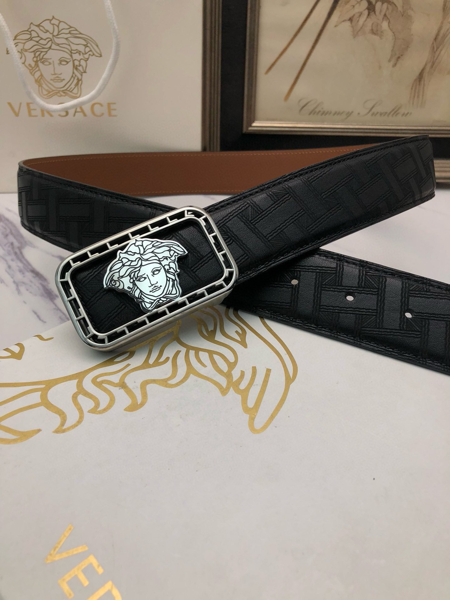 Versace Gold Square Buckle Black Belt Classic Fashion Low key Luxury $210.00 Original price was: $210.00.$66.69Current price is: $66.69.