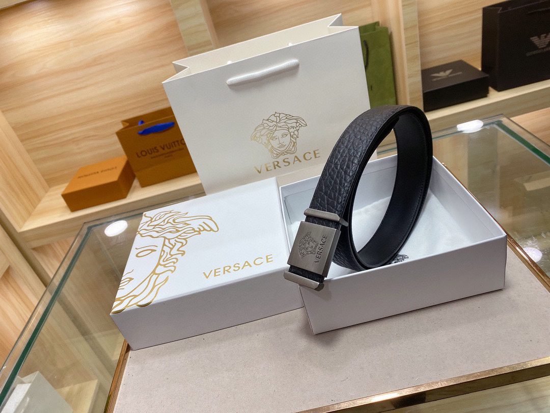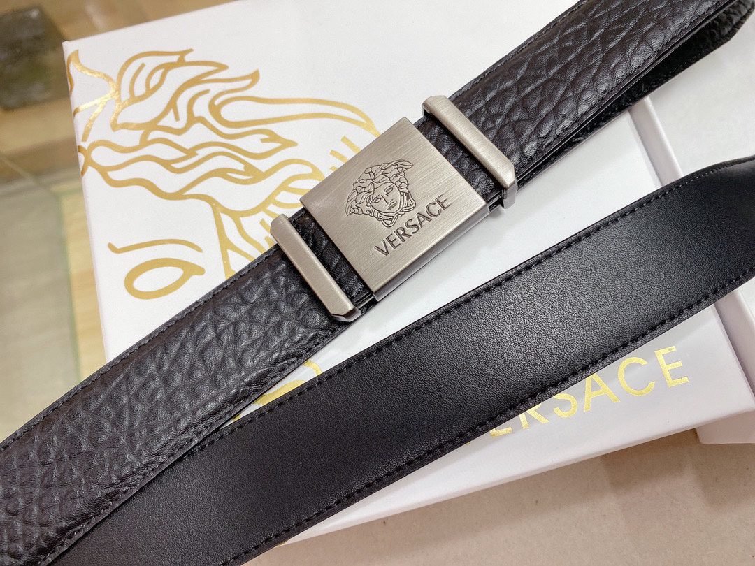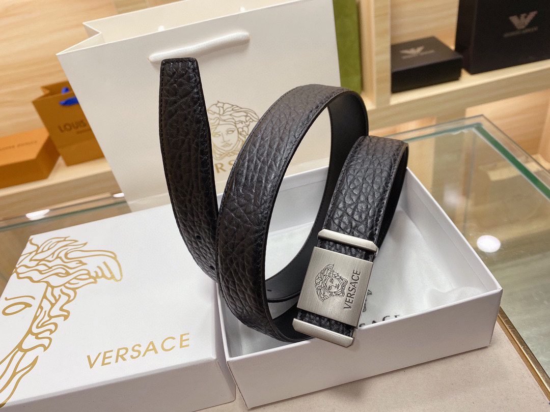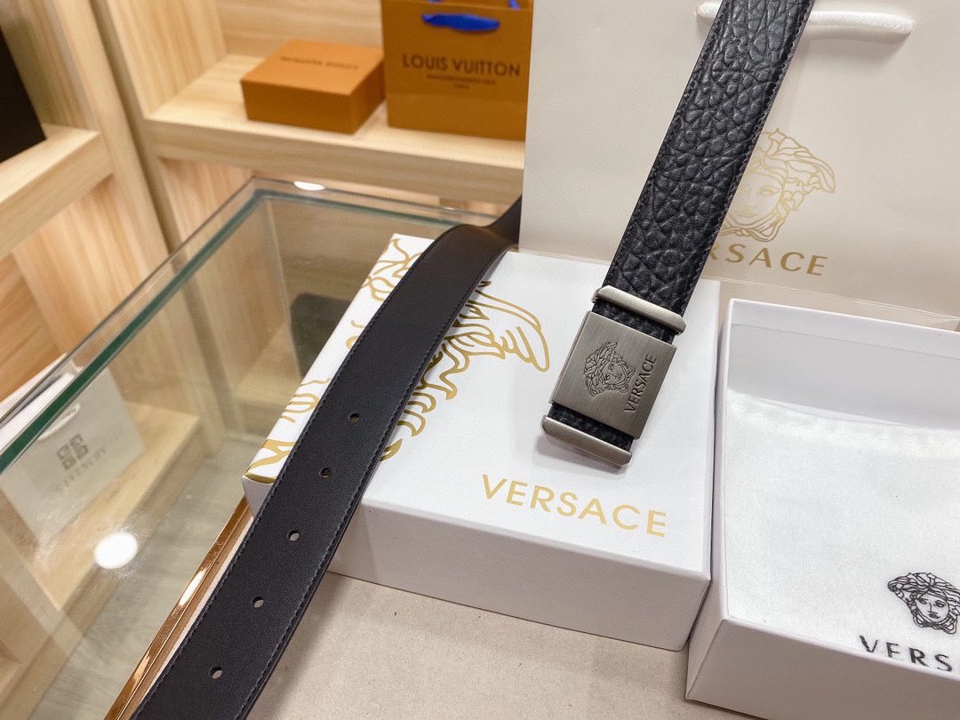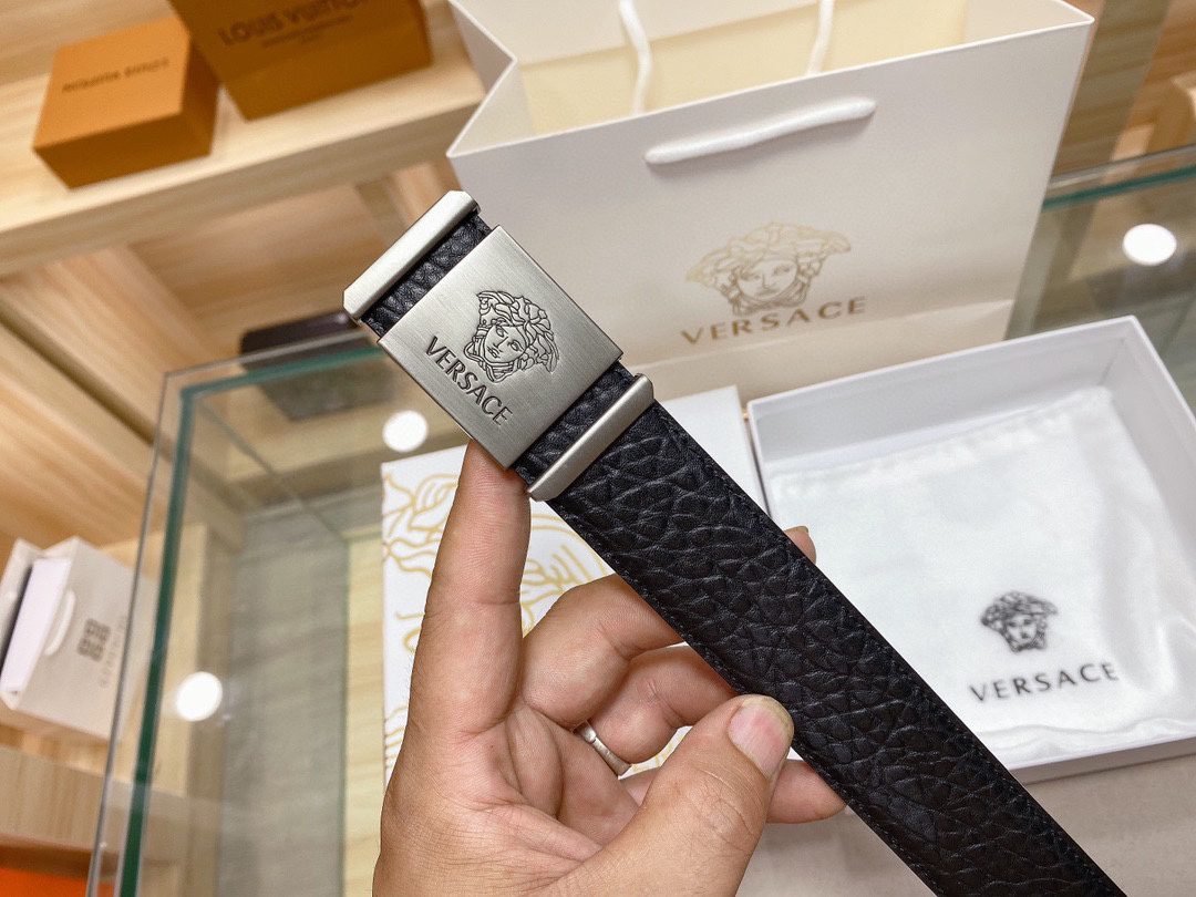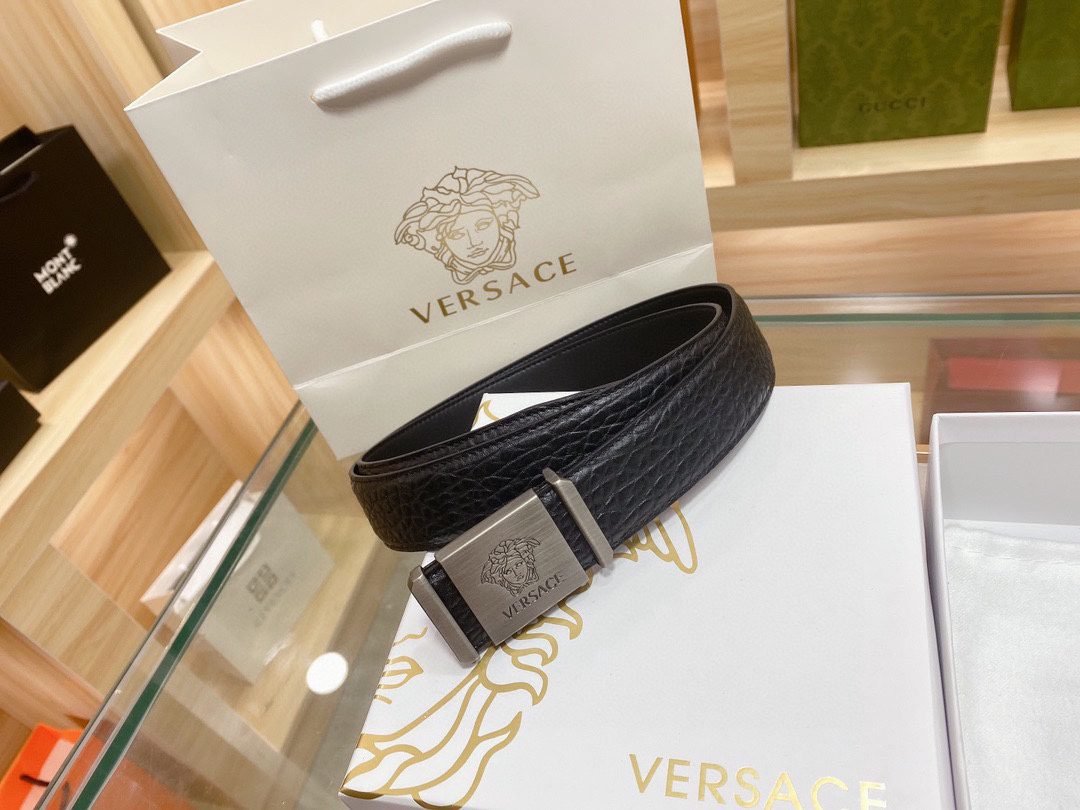 Home Belt VERSACE Belt Versace Silver Square Buckle Black Texture Belt Classic Fashion Noble and Elegant