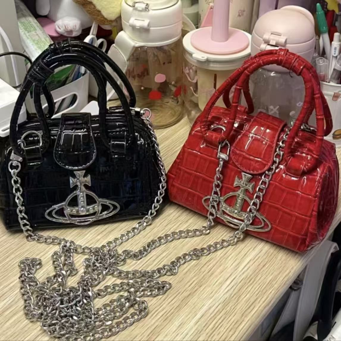 Embrace the rebellious elegance of Vivienne Westwood with this mini satchel, a bold fusion of punk spirit and luxury design. Crafted from glossy crocodile-embossed leather in classic black and vibrant red, it features the brand’s iconic Saturn Orb hardware — a symbol of avant-garde style that instantly elevates any look.