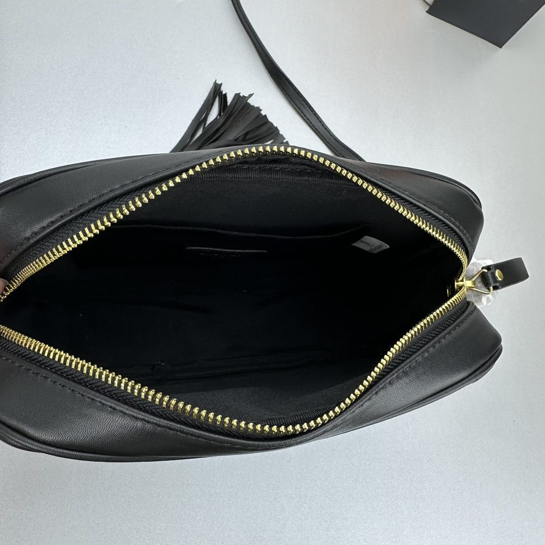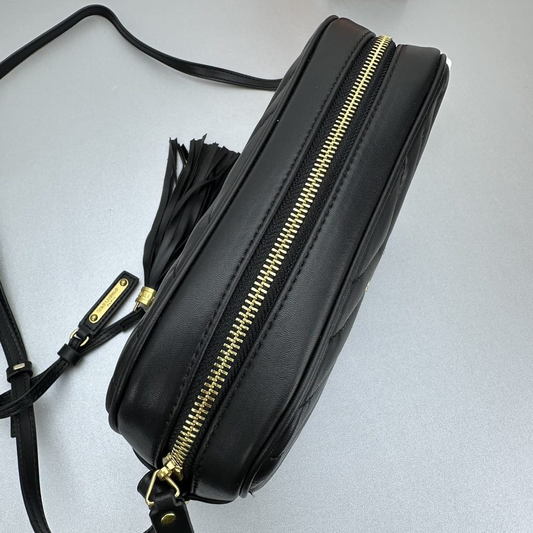 Calfskin forged lining with LAURENT-ENGRAVED metal plaques adorn the zipper. Brush bronze tone metal hardware. Slot pocket shoulder strap vertical: 62 cm