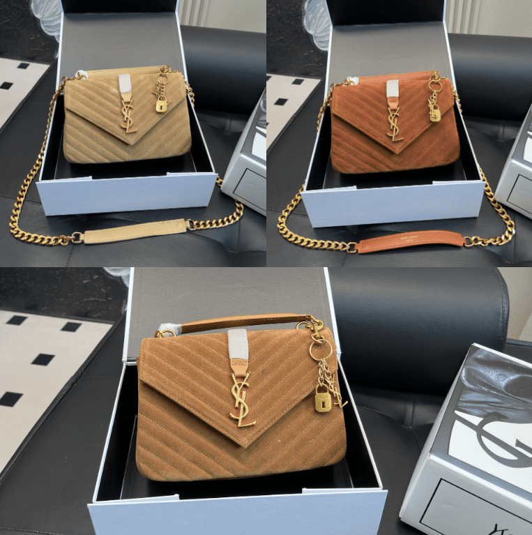 This YSL suede shoulder bag collection features the brand’s iconic YSL logo, crafted from premium suede with a structured silhouette of 26×17cm, complemented by gold-tone chain straps and charm details. Embodying YSL’s legacy of tactile luxury and retro-chic design, the bags are available in sophisticated suede hues, merging timeless elegance with modern versatility. Perfect for those who appreciate iconic branding, meticulous craftsmanship, and a statement piece that adds a touch of refined texture to both casual and elevated looks, seamlessly transitioning from day to night.