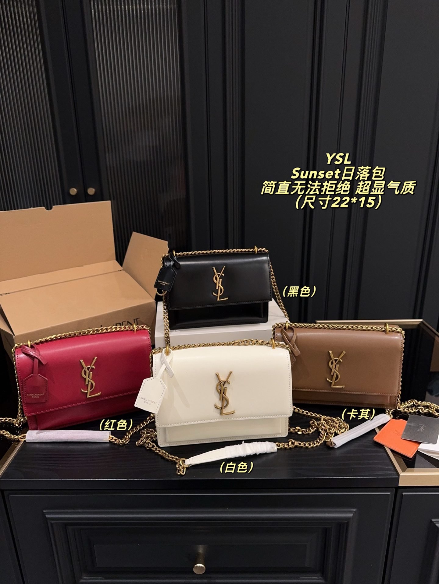 This YSL Sunset crossbody bag collection features the brand’s iconic YSL logo, crafted from premium leather with a structured silhouette of 22×15cm and metallic chain straps. Embodying YSL’s legacy of Parisian elegance and bold sophistication, the bags are available in captivating hues like black, red, white, and khaki. Merging timeless design with modern allure, they’re perfect for those who appreciate iconic branding, meticulous craftsmanship, and a statement piece that effortlessly elevates every look—from casual outings to glamorous events—with undeniable chicness.